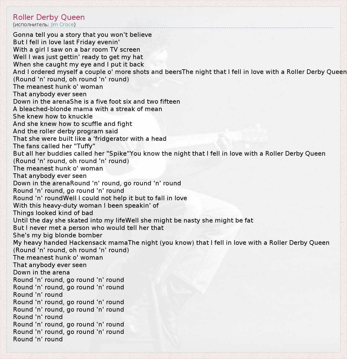 Gonna tell you a story that you won't believe But I fell in love last Friday evenin' With a girl I saw on a bar room TV screen Well I was just gettin' ready to get my hat When she caught my eye and I put it back And I ordered myself a couple o' more shots and beersThe night that I fell in love with a Roller Derby Queen (Round 'n' round, oh round 'n' round) The meanest hunk o' woman That anybody ever seen Down in the arenaShe is a five foot six and two fifteen A bleached-blonde mama with a streak of mean She knew how to knuckle And she knew how to scuffle and fight And the roller derby program said That she were built like a 'fridgerator with a head The fans called her "Tuffy" But all her buddies called her "Spike"You know the night that I fell in love with a Roller Derby Queen (Round 'n' round, oh round 'n' round) The meanest hunk o' woman That anybody ever seen Down in the arenaRound 'n' round, go round 'n' round Round 'n' round, go round 'n' round Round 'n' roundWell I could not help it but to fall in love With this heavy-duty woman I been speakin' of Things looked kind of bad Until the day she skated into my lifeWell she might be nasty she might be fat But I never met a person who would tell her that She's my big blonde bomber My heavy handed Hackensack mamaThe night (you know) that I fell in love with a Roller Derby Queen (Round 'n' round, oh round 'n' round) The meanest hunk o' woman That anybody ever seen Down in the arena Round 'n' round, go round 'n' round Round 'n' round, go round 'n' round Round 'n' round Round 'n' round, go round 'n' round Round 'n' round, go round 'n' round Round 'n' round Round 'n' round, go round 'n' round Round 'n' round, go round 'n' round Round 'n' round