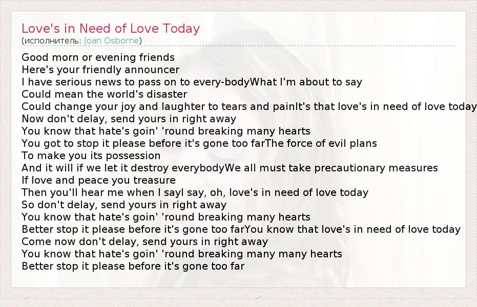 А как ты думаешь, о чем песня "Love's in Need of Love Today" ?