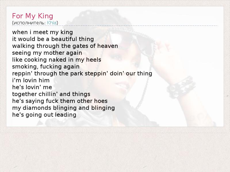 when i meet my king it would be a beautiful thing walking through the gates of heaven seeing my mother again like cooking naked in my heels smoking, fucking again reppin' through the park steppin' doin' our thing i'm lovin him he's lovin' me together chillin' and things he's saying fuck them other hoes my diamonds blinging and blinging he's going out leading