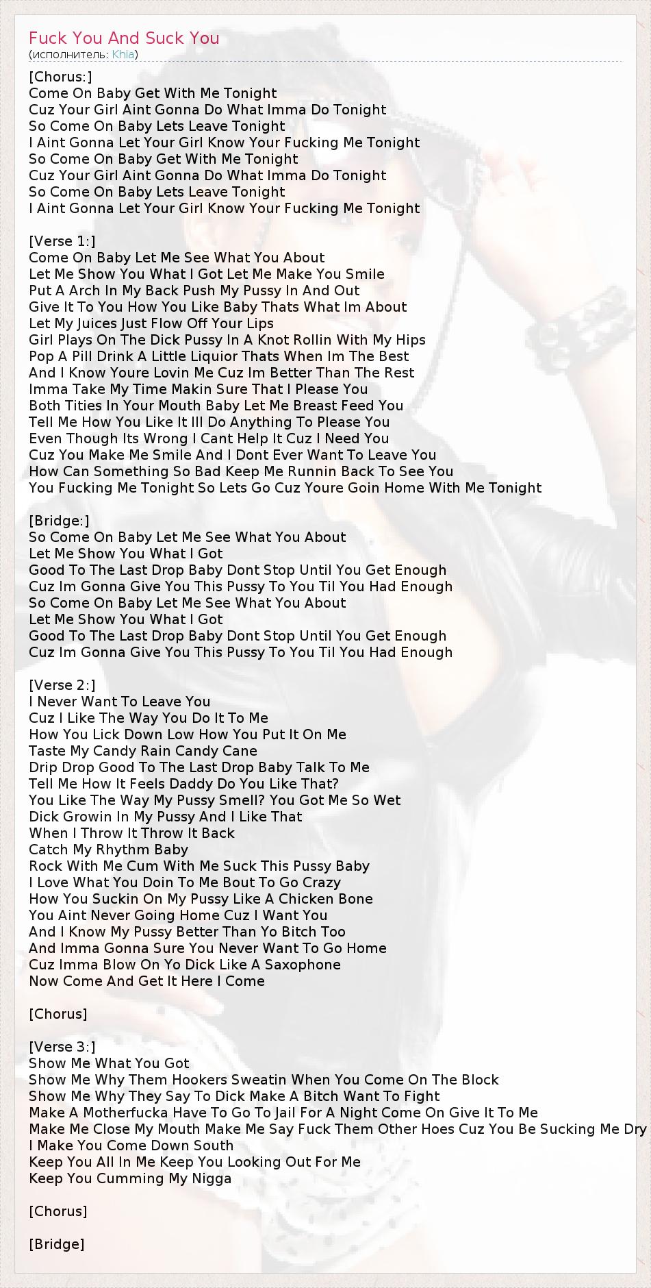 [Chorus:] Come On Baby Get With Me Tonight Cuz Your Girl Aint Gonna Do What Imma Do Tonight So Come On Baby Lets Leave Tonight I Aint Gonna Let Your Girl Know Your Fucking Me Tonight So Come On Baby Get With Me Tonight Cuz Your Girl Aint Gonna Do What Imma Do Tonight So Come On Baby Lets Leave Tonight I Aint Gonna Let Your Girl Know Your Fucking Me Tonight [Verse 1:] Come On Baby Let Me See What You About Let Me Show You What I Got Let Me Make You Smile Put A Arch In My Back Push My Pussy In And Out Give It To You How You Like Baby Thats What Im About Let My Juices Just Flow Off Your Lips Girl Plays On The Dick Pussy In A Knot Rollin With My Hips Pop A Pill Drink A Little Liquior Thats When Im The Best And I Know Youre Lovin Me Cuz Im Better Than The Rest Imma Take My Time Makin Sure That I Please You Both Tities In Your Mouth Baby Let Me Breast Feed You Tell Me How You Like It Ill Do Anything To Please You Even Though Its Wrong I Cant Help It Cuz I Need You Cuz You Make Me Smile And I Dont Ever Want To Leave You How Can Something So Bad Keep Me Runnin Back To See You You Fucking Me Tonight So Lets Go Cuz Youre Goin Home With Me Tonight [Bridge:] So Come On Baby Let Me See What You About Let Me Show You What I Got Good To The Last Drop Baby Dont Stop Until You Get Enough Cuz Im Gonna Give You This Pussy To You Til You Had Enough So Come On Baby Let Me See What You About Let Me Show You What I Got Good To The Last Drop Baby Dont Stop Until You Get Enough Cuz Im Gonna Give You This Pussy To You Til You Had Enough [Verse 2:] I Never Want To Leave You Cuz I Like The Way You Do It To Me How You Lick Down Low How You Put It On Me Taste My Candy Rain Candy Cane Drip Drop Good To The Last Drop Baby Talk To Me Tell Me How It Feels Daddy Do You Like That? You Like The Way My Pussy Smell? You Got Me So Wet Dick Growin In My Pussy And I Like That When I Throw It Throw It Back Catch My Rhythm Baby Rock With Me Cum With Me Suck This Pussy Baby I Love What You Doin To Me Bout To Go Crazy How You Suckin On My Pussy Like A Chicken Bone You Aint Never Going Home Cuz I Want You And I Know My Pussy Better Than Yo Bitch Too And Imma Gonna Sure You Never Want To Go Home Cuz Imma Blow On Yo Dick Like A Saxophone Now Come And Get It Here I Come [Chorus] [Verse 3:] Show Me What You Got Show Me Why Them Hookers Sweatin When You Come On The Block Show Me Why They Say To Dick Make A Bitch Want To Fight Make A Motherfucka Have To Go To Jail For A Night Come On Give It To Me Make Me Close My Mouth Make Me Say Fuck Them Other Hoes Cuz You Be Sucking Me Dry I Make You Come Down South Keep You All In Me Keep You Looking Out For Me Keep You Cumming My Nigga [Chorus] [Bridge]