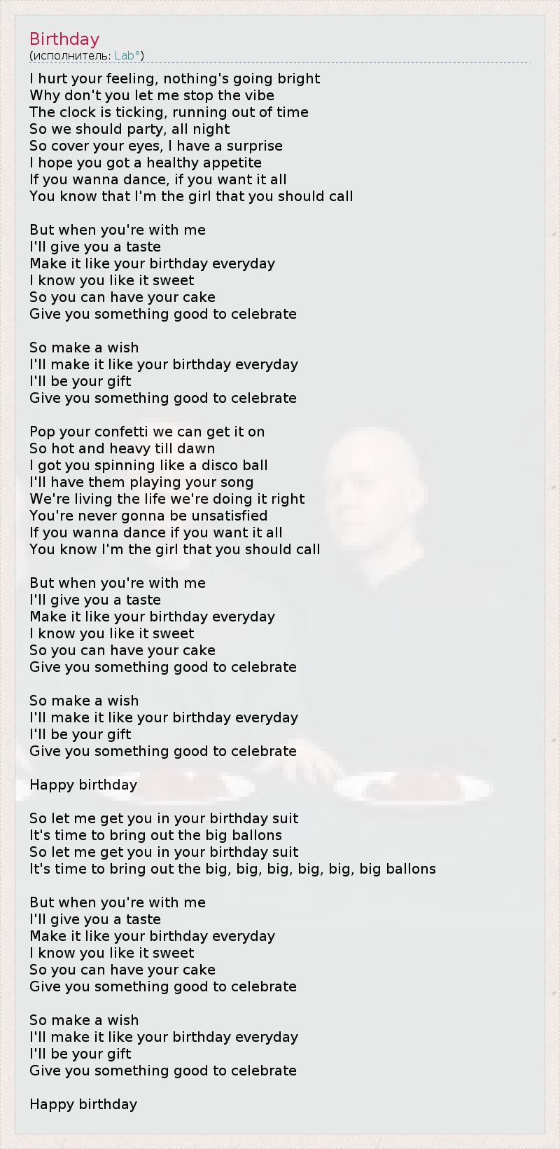 Я задела твои чувства, всё стало слишком плохо, Так почему ты не остановишь меня? Часы тикают, время уходит, Давай же будем отрываться ночь напролёт. Закрой глаза, у меня для тебя сюрприз, Надеюсь, ты голоден? Если хочешь потанцевать и оторваться, То знай: я – та, кому тебе следует позвонить. Ведь когда ты со мной, Я дам тебе попробовать, Я превращу каждый твой день в день рождения Я знаю, ты любишь сладости, Угощайся тортом, Я найду для тебя повод отпраздновать. Загадай желание, Я превращу каждый день в день рождения, Я буду твоим подарком, Я найду тебе повод отпраздновать. Взрывай хлопушки, давай расслабимся, Ведь здесь так жарко и душно до самого рассвета Я вскружу тебя голову, словно диско-шар, И попрошу, чтобы включили твою любимую песню. Мы наслаждаемся жизнью, мы всё делаем правильно, Ты останешься доволен, Если хочешь потанцевать и оторваться, То знай, я – та, кому тебе следует позвонить. Ведь когда ты со мной, Я дам тебе попробовать, Я превращу каждый твой день в день рождения Знаю, ты любишь сладости, Угощайся тортом, Я найду для тебя повод отпраздновать. Загадай желание, Я превращу каждый день в день рождения, Я буду твоим подарком, Я найду тебе повод отпраздновать. С днём рождения! Разреши мне одеть тебя в то, в чём ты появился на свет, Самое время отпустить воздушные шары, Разреши мне одеть тебя в то, в чём ты появился на свет, Самое время отпустить воздушные шары. Ведь когда ты со мной, Я дам тебе попробовать, Я превращу каждый твой день в день рождения Знаю, ты любишь сладости, Угощайся тортом, Я найду для тебя повод отпраздновать. Загадай желание, Я превращу каждый день в день рождения, Я буду твоим подарком, Я найду для тебя повод отпраздновать. С днём рождения!