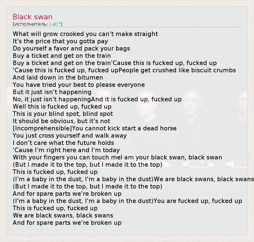 What will grow crooked you can't make straight It's the price that you gotta pay Do yourself a favor and pack your bags Buy a ticket and get on the train Buy a ticket and get on the train'Cause this is fucked up, fucked up 'Cause this is fucked up, fucked upPeople get crushed like biscuit crumbs And laid down in the bitumen You have tried your best to please everyone But it just isn't happening No, it just isn't happeningAnd it is fucked up, fucked up Well this is fucked up, fucked up This is your blind spot, blind spot It should be obvious, but it's not [Incomprehensible]You cannot kick start a dead horse You just cross yourself and walk away I don't care what the future holds 'Cause I'm right here and I'm today With your fingers you can touch meI am your black swan, black swan (But I made it to the top, but I made it to the top) This is fucked up, fucked up (I'm a baby in the dust, I'm a baby in the dust)We are black swans, black swans (But I made it to the top, but I made it to the top) And for spare parts we're broken up (I'm a baby in the dust, I'm a baby in the dust)You are fucked up, fucked up This is fucked up, fucked up We are black swans, black swans And for spare parts we're broken up