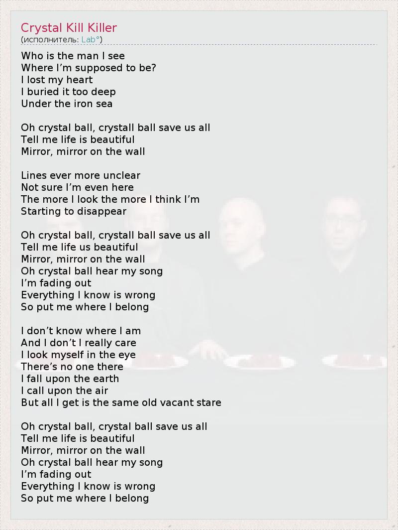 Who is the man I see Where I’m supposed to be? I lost my heart I buried it too deep Under the iron sea Oh crystal ball, crystall ball save us all Tell me life is beautiful Mirror, mirror on the wall Lines ever more unclear Not sure I’m even here The more I look the more I think I’m Starting to disappear Oh crystal ball, crystall ball save us all Tell me life us beautiful Mirror, mirror on the wall Oh crystal ball hear my song I’m fading out Everything I know is wrong So put me where I belong I don’t know where I am And I don’t I really care I look myself in the eye There’s no one there I fall upon the earth I call upon the air But all I get is the same old vacant stare Oh crystal ball, crystal ball save us all Tell me life is beautiful Mirror, mirror on the wall Oh crystal ball hear my song I’m fading out Everything I know is wrong So put me where I belong