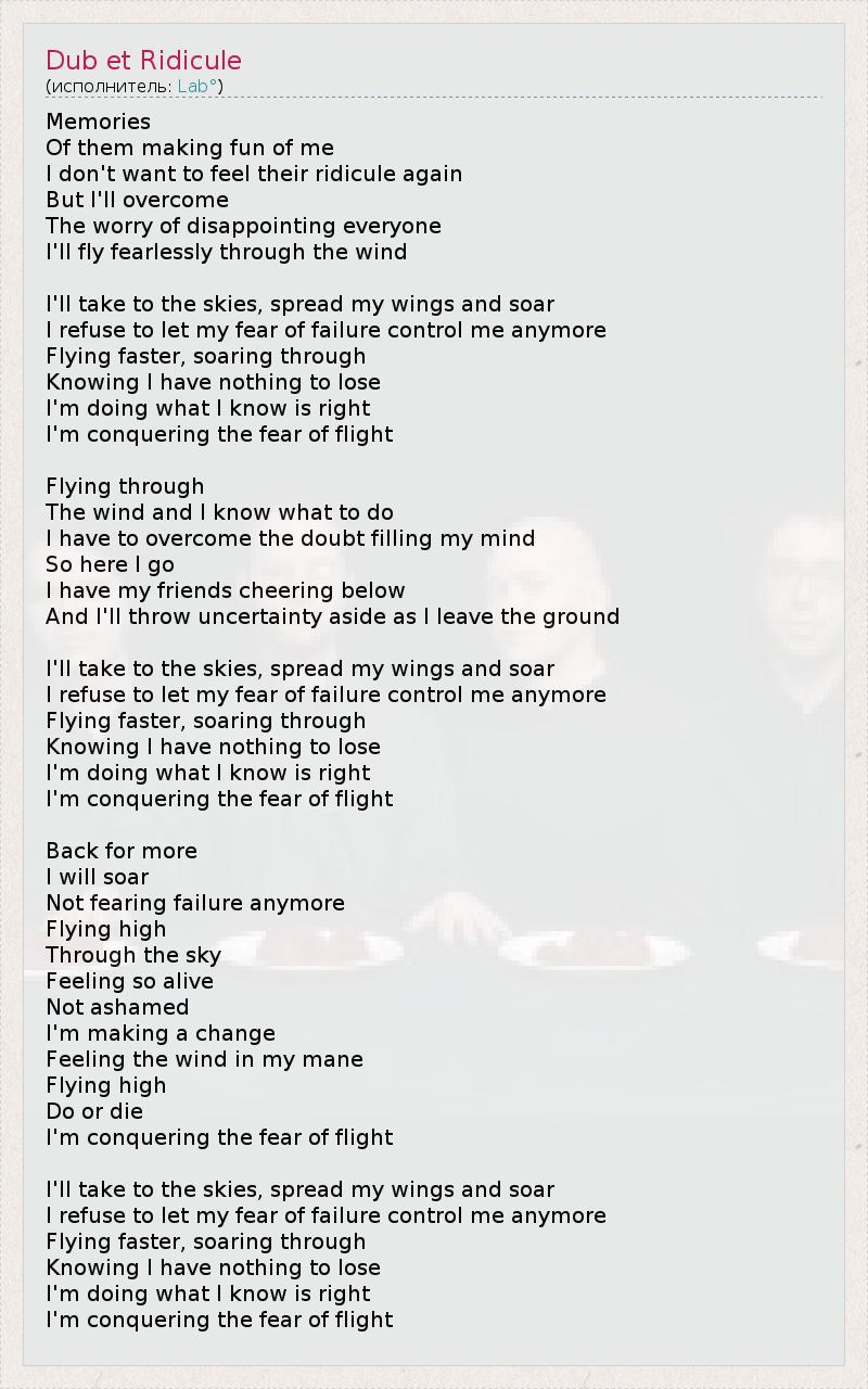 Воспоминания о том, Как они смеялись надо мной... Не хочу снова испытать их насмешки, Но я преодолею Боязнь всех разочаровать, Я бесстрашно взлечу навстречу ветру. Я взмою в небо, расправлю крылья и воспарю, Я не позволю страху ошибки мной управлять. Лечу быстрее, рассекая воздух, Зная, что мне нечего терять. Я делаю то, что считаю правильным, Я побеждаю боязнь полёта. Лечу навстречу Ветру, и я знаю что делаю. Я борюсь с сомнениями, заполнившими разум. Вон она я, Мои друзья восхищаются внизу, И я отбрасываю неуверенность, покидая землю. Я взмою в небо, расправлю крылья и воспарю, Я не позволю страху ошибки мной управлять. Лечу быстрее, рассекая воздух, Зная, что мне нечего терять. Я делаю то, что считаю правильным, Я побеждаю боязнь полёта. Желая продолжения, Я воспарю, Без страха ошибиться. Лечу высоко Сквозь небеса, Чувствую себя живой. Не пристыженная, Я изменилась, Чувство ветра в волосах... Лечу высоко, Победа или смерть - Я побеждаю страх полёта. Я взмою в небо, расправлю крылья и воспарю, Я не позволю страху ошибки мной управлять. Лечу быстрее, рассекая воздух, Зная, что мне нечего терять. Я делаю то, что считаю правильным, Я побеждаю боязнь полёта.