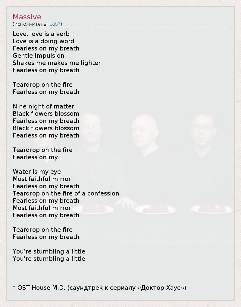 Love, love is a verb Love is a doing word Fearless on my breath Gentle impulsion Shakes me makes me lighter Fearless on my breath Teardrop on the fire Fearless on my breath Nine night of matter Black flowers blossom Fearless on my breath Black flowers blossom Fearless on my breath Teardrop on the fire Fearless on my... Water is my eye Most faithful mirror Fearless on my breath Teardrop on the fire of a confession Fearless on my breath Most faithful mirror Fearless on my breath Teardrop on the fire Fearless on my breath You're stumbling a little You're stumbling a little * OST House M.D. (саундтрек к сериалу «Доктор Хаус»)
