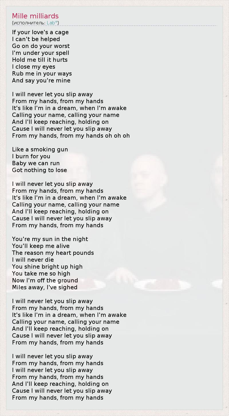 If your love's a cage I can't be helped Go on do your worst I'm under your spell Hold me till it hurts I close my eyes Rub me in your ways And say you're mine I will never let you slip away From my hands, from my hands It's like I'm in a dream, when I'm awake Calling your name, calling your name And I'll keep reaching, holding on Cause I will never let you slip away From my hands, from my hands oh oh oh Like a smoking gun I burn for you Baby we can run Got nothing to lose I will never let you slip away From my hands, from my hands It's like I'm in a dream, when I'm awake Calling your name, calling your name And I'll keep reaching, holding on Cause I will never let you slip away From my hands, from my hands You're my sun in the night You'll keep me alive The reason my heart pounds I will never die You shine bright up high You take me so high Now I'm off the ground Miles away, I've sighed I will never let you slip away From my hands, from my hands It's like I'm in a dream, when I'm awake Calling your name, calling your name And I'll keep reaching, holding on Cause I will never let you slip away From my hands, from my hands I will never let you slip away From my hands, from my hands I will never let you slip away From my hands, from my hands And I'll keep reaching, holding on Cause I will never let you slip away From my hands, from my hands