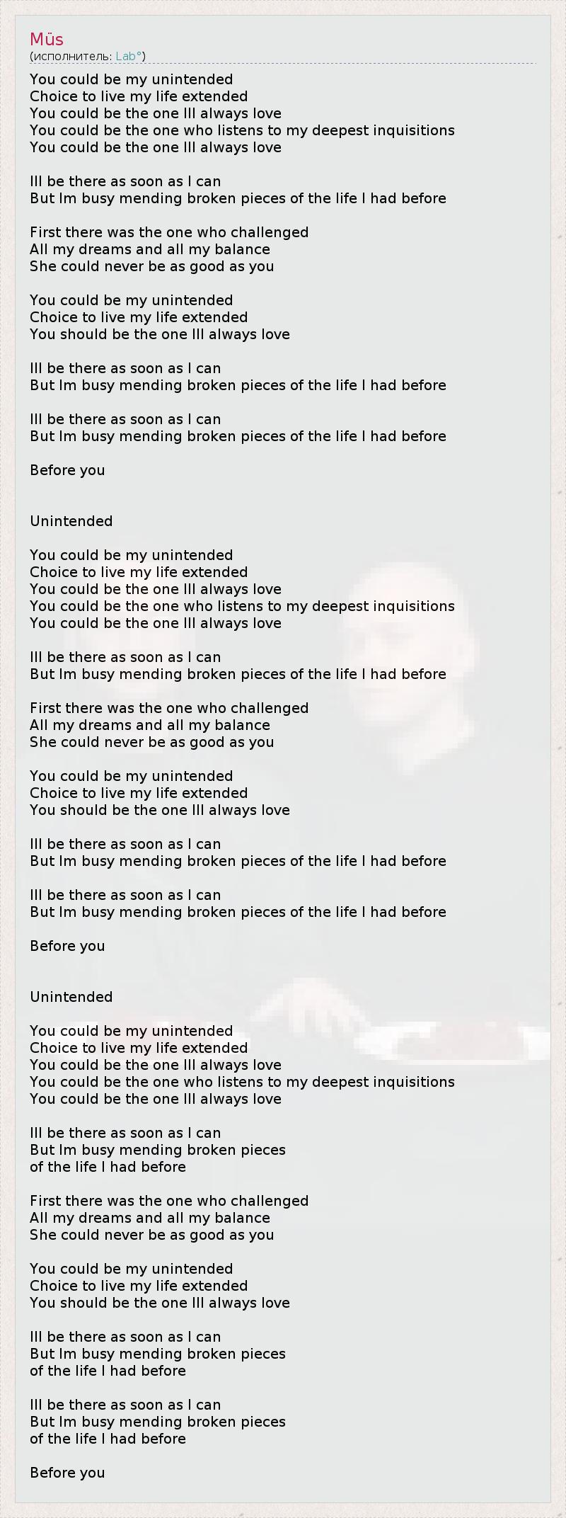 You could be my unintended Choice to live my life extended You could be the one Ill always love You could be the one who listens to my deepest inquisitions You could be the one Ill always love Ill be there as soon as I can But Im busy mending broken pieces of the life I had before First there was the one who challenged All my dreams and all my balance She could never be as good as you You could be my unintended Choice to live my life extended You should be the one Ill always love Ill be there as soon as I can But Im busy mending broken pieces of the life I had before Ill be there as soon as I can But Im busy mending broken pieces of the life I had before Before you Unintended You could be my unintended Choice to live my life extended You could be the one Ill always love You could be the one who listens to my deepest inquisitions You could be the one Ill always love Ill be there as soon as I can But Im busy mending broken pieces of the life I had before First there was the one who challenged All my dreams and all my balance She could never be as good as you You could be my unintended Choice to live my life extended You should be the one Ill always love Ill be there as soon as I can But Im busy mending broken pieces of the life I had before Ill be there as soon as I can But Im busy mending broken pieces of the life I had before Before you Unintended You could be my unintended Choice to live my life extended You could be the one Ill always love You could be the one who listens to my deepest inquisitions You could be the one Ill always love Ill be there as soon as I can But Im busy mending broken pieces of the life I had before First there was the one who challenged All my dreams and all my balance She could never be as good as you You could be my unintended Choice to live my life extended You should be the one Ill always love Ill be there as soon as I can But Im busy mending broken pieces of the life I had before Ill be there as soon as I can But Im busy mending broken pieces of the life I had before Before you