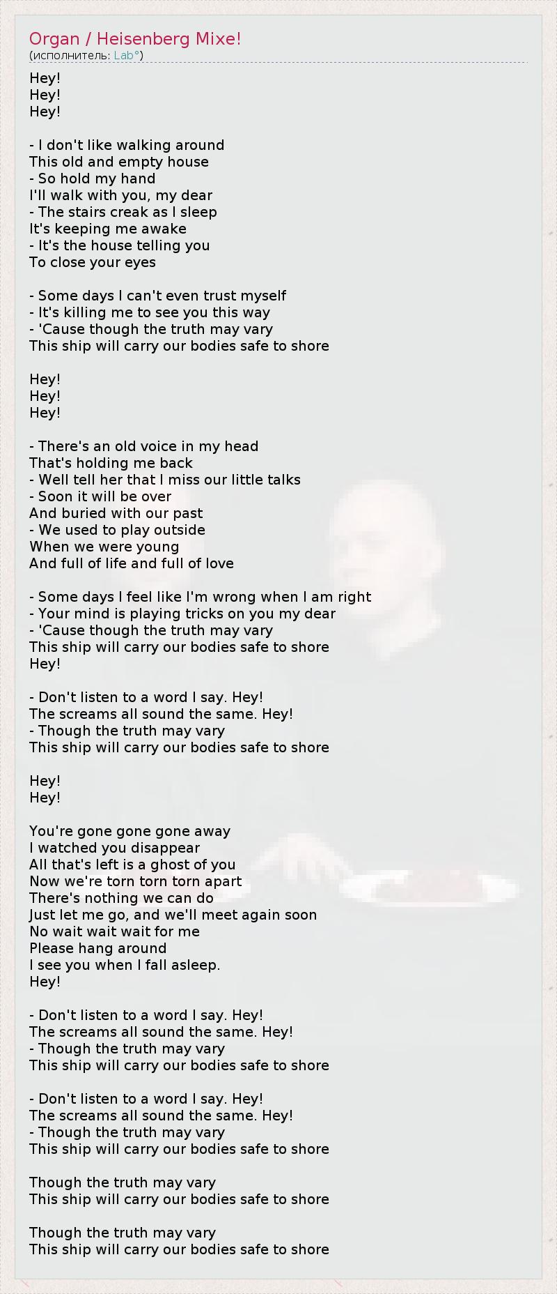Хэй! Хэй! Хэй! - Я не люблю бродить вокруг Этого старого пустого дома. - Так возьми меня за руку, Пройдёмся вместе, дорогая. - Скрип ступенек Не даёт мне уснуть. - Это дом подсказывает тебе Закрыть глаза. - Порой я даже себе не доверяю. - Меня убивает видеть тебя такой. - И хотя правда переменчива, Корабль этот доставит нас к берегу невредимыми. Хэй! Хэй! Хэй! - В голове знакомый голос, Который не отпускает меня. - Что ж, скажи ей, что мне не хватает небольших бесед. - Скоро всё будет кончено, Похоронено вместе с нашим прошлым. - Будучи юнцами, Мы играли во дворе И были полны жизни и любви. - Порой я чувствую, будто неправа, хотя это не так. - Твой разум играет с тобой, дорогая. - И хотя правда переменчива, Корабль этот доставит нас к берегу невредимыми. Хэй! - Не обращай внимания на мои слова. Хэй! Все вопли похожи. Хэй! - И хотя правда переменчива, Корабль этот доставит нас к берегу невредимыми. Хэй! Хэй! Ты ушёл, покинул меня, И я видела, как ты исчезаешь - Кроме твоего призрака ничего не осталось. Теперь мы не вместе, расстались, И ничего с этим не поделать - Просто отпусти меня, и вскоре мы вновь встретимся. Нет, подожди меня, постой, Прошу, будь рядом - Я вижу тебя в своих снах. Хэй! - Не обращай внимания на мои слова. Хэй! Все вопли похожи. Хэй! - И хотя правда переменчива, Корабль этот доставит нас к берегу невредимыми. - Не обращай внимания на мои слова. Хэй! Все вопли похожи. Хэй! - И хотя правда переменчива, Корабль этот доставит нас к берегу невредимыми. И хотя правда переменчива, Корабль этот доставит нас к берегу невредимыми. И хотя правда переменчива, Корабль этот доставит нас к берегу невредимыми.