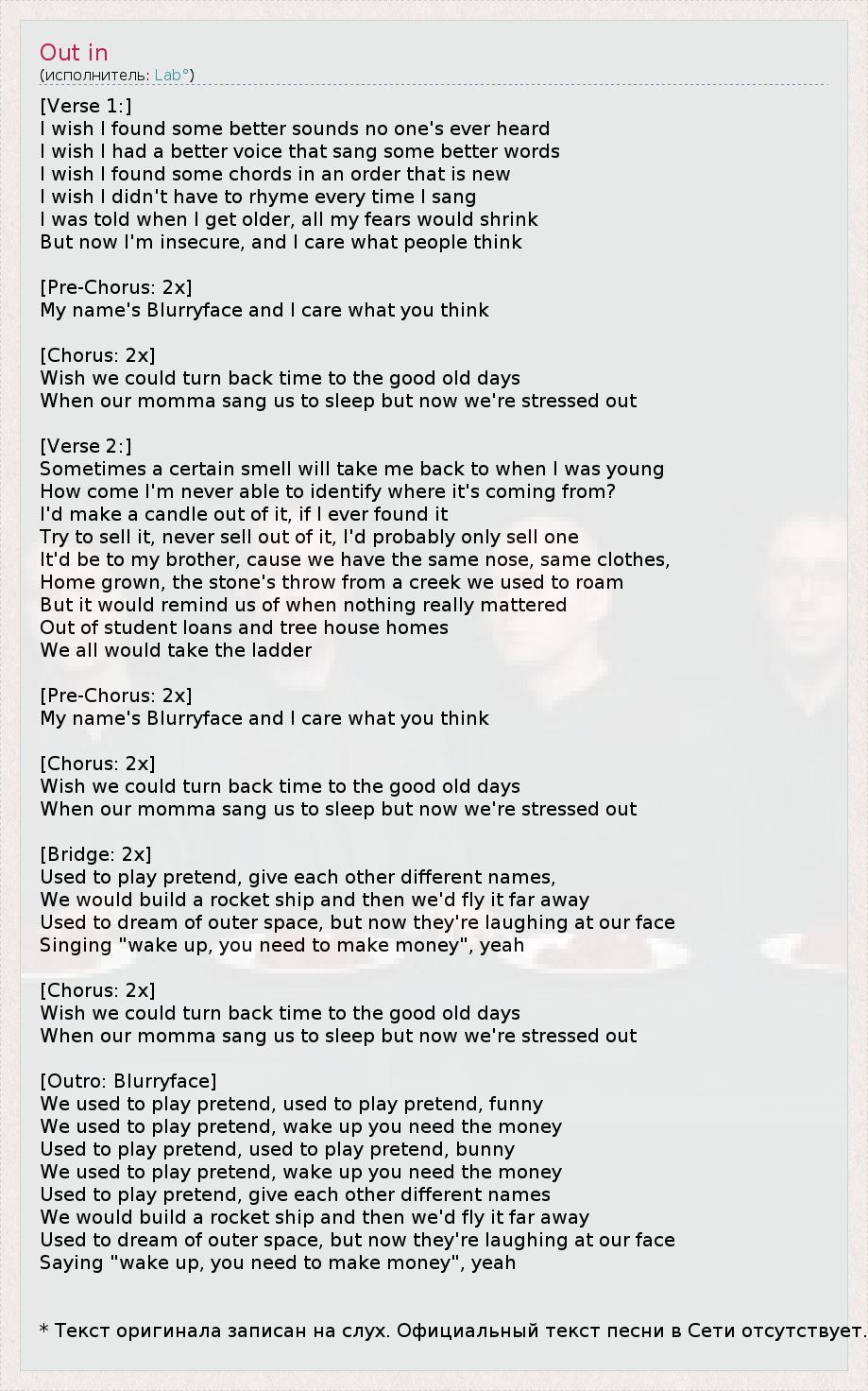 [1 куплет:] Я хотел бы найти лучший звук, какого ещё никто не слышал. Я хотел бы иметь лучший голос, который пел бы лучшие слова. Я хотел бы подобрать совершенно новые звучности. Я хотел бы, чтобы мне не надо было рифмовать слова, когда я пою. Мне говорили, что когда я вырасту, все мои страхи испарятся, Но сейчас я не уверен в себе, и мне не всё равно, что обо мне думают. [Распевка: 2x] Меня зовут Blurryface, 1 и мне не всё равно, что вы думаете. [Припев: 2x] Я хотел бы, чтобы мы могли вернуться в старые добрые времена, Когда мама убаюкивала нас перед сном, но сейчас мы под стрессом. [2 куплет:] Когда-нибудь я почую запах, который приведёт меня туда, где я был молод. Как же я раньше не мог найти, откуда я? Я бы сделал себе свечу, если бы нашёл это место. Я продавал бы их, но не все, а только одну. Я пошел бы к брату, ведь у нас одинаковые носы, одинаковая одежда, Отчий дом в двух шагах от бухты, где мы когда-то гуляли. Это напоминало бы нам о временах, когда всё было просто. Чтобы вылезти из образовательных кредитов и домов на деревьях, Мы взяли бы лестницу. [Распевка: 2x] Меня зовут Blurryface, и мне не всё равно, что вы думаете. [Припев: 2x] Я хотел бы, чтобы мы могли вернуться в старые добрые времена, Когда мама убаюкивала нас перед сном, но сейчас мы под стрессом. [Переход: 2x] Когда-то мы играли, давая друг другу разные имена, Мы строили космический корабль и улетали на нём далеко, Мечтали об открытом космосе, а теперь нам смеются в лицо И поют: "Очнитесь, пора зарабатывать деньги!". Да! [Припев: 2x] Я хотел бы, чтобы мы могли вернуться в старые добрые времена, Когда мама убаюкивала нас перед сном, но сейчас мы под стрессом. [Окончание: Blurryface] Когда-то мы играли, когда-то мы играли, и это было забавно. Когда-то мы играли. "Очнитесь, пора зарабатывать деньги!" Когда-то мы играли, когда-то мы играли, зайка. Когда-то мы играли. "Очнитесь, пора зарабатывать деньги!" Когда-то мы играли, давая друг другу разные имена, Мы строили космический корабль и улетали на нём далеко, Мечтали об открытом космосе, а теперь нам смеются в лицо И говорят: "Очнитесь, пора зарабатывать деньги!". Да! 1 – Blurryface – альтер-эго и "тёмная половина" Тайлера Джозефа.