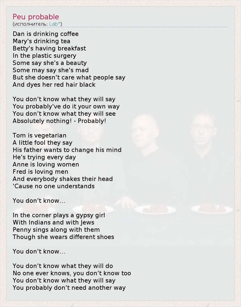 Dan is drinking coffee Mary's drinking tea Betty's having breakfast In the plastic surgery Some say she's a beauty Some may say she's mad But she doesn't care what people say And dyes her red hair black You don't know what they will say You probably've do it your own way You don't know what they will see Absolutely nothing! - Probably! Tom is vegetarian A little fool they say His father wants to change his mind He's trying every day Anne is loving women Fred is loving men And everybody shakes their head 'Cause no one understands You don't know… In the corner plays a gypsy girl With Indians and with Jews Penny sings along with them Though she wears different shoes You don't know… You don't know what they will do No one ever knows, you don't know too You don't know what they will say You probably don't need another way