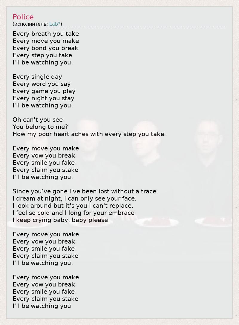 Every breath you take Every move you make Every bond you break Every step you take I'll be watching you. Every single day Every word you say Every game you play Every night you stay I'll be watching you. Oh can't you see You belong to me? How my poor heart aches with every step you take. Every move you make Every vow you break Every smile you fake Every claim you stake I'll be watching you. Since you've gone I've been lost without a trace. I dream at night, I can only see your face. I look around but it's you I can't replace. I feel so cold and I long for your embrace I keep crying baby, baby please Every move you make Every vow you break Every smile you fake Every claim you stake I'll be watching you. Every move you make Every vow you break Every smile you fake Every claim you stake I'll be watching you