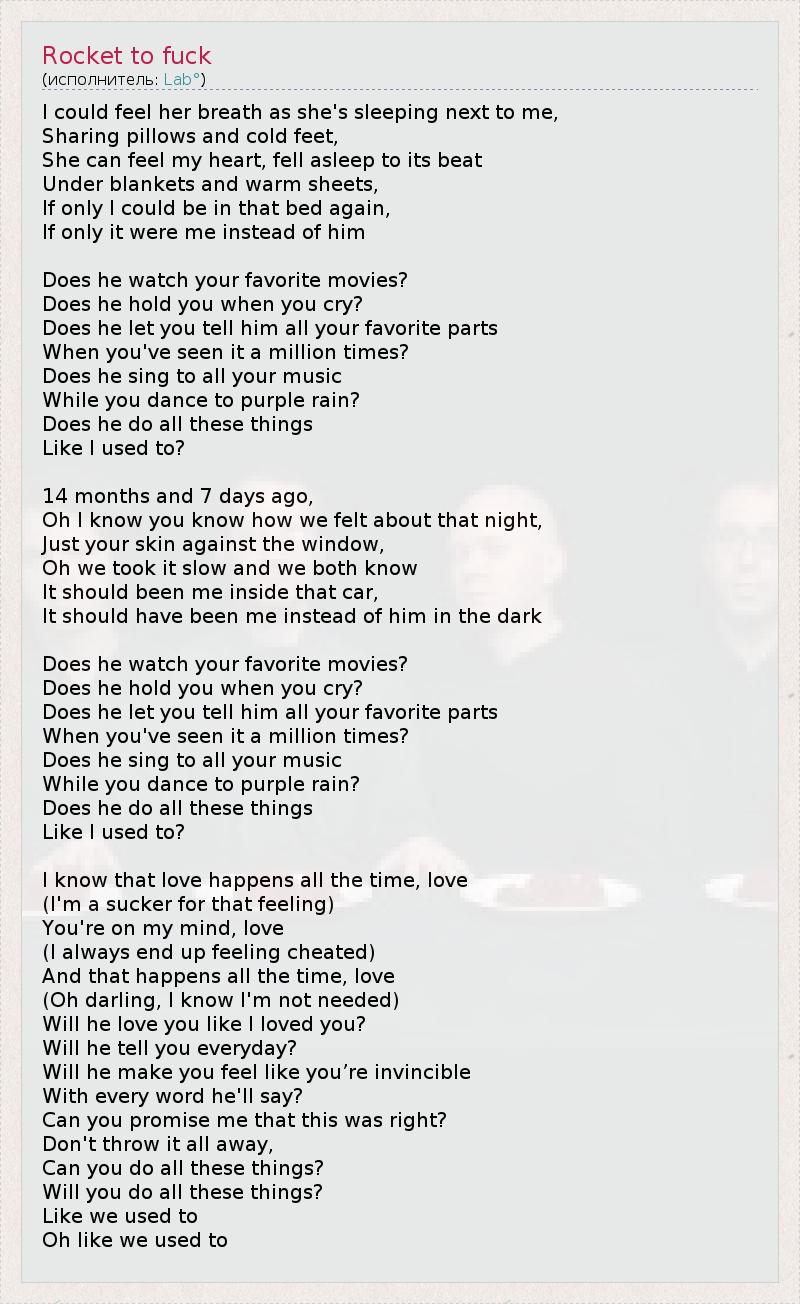 Я мог чувствовать ее дыхание, когда она спала рядом со мной, На общих подушках и с холодными ногами, Она могла слышать мое сердце, засыпала под его биение Под одеялами и на теплых простынях, Если бы мог я оказаться в этой кровати снова, Если бы я был вместо него Смотрит ли он твои любимые фильмы? Обнимает ли он тебя, когда ты плачешь? Позволяет ли он тебе рассказывать твои любимые Моменты из фильмов, которые ты видела миллион раз? Подпевает ли он под твою музыку, Когда ты танцуешь под пурпурный дождь? Делает ли он все эти вещи, Как делал раньше я? 14 месяцев и 7 дней назад, Ох, мы знаем, что это была за ночь, Лишь твое кожа, ты прижата к стеклу, Ох, мы делали это медленно, мы оба знаем, Что это я должен был быть внутри той машины, Это я должен был быть вместо него в темноте Смотрит ли он твои любимые фильмы? Обнимает ли он тебя, когда ты плачешь? Позволяет ли он тебе рассказывать твои любимые Моменты из фильмов, которые ты видела миллион раз? Подпевает ли он под твою музыку, Когда ты танцуешь под пурпурный дождь? Делает ли он все эти вещи, Как делал раньше я? Я знаю, любовь случается постоянно, любовь (Я неопытен в этом чувстве) Ты у меня в мыслях, любовь (Я всегда в конечном итоге чувствую себя обманутым) И это случается постоянно, любовь (О, дорогая, я знаю, я не нужен) Будет ли он любить тебя так, как любил тебя я? Будет ли он говорить тебе это каждый день? Будешь ли ты чувствовать себя непобедимой С каждым словом, которое он произнесет? Можешь ты обещать мне, что все, что произошло, правильно? Не отказывайся от всего этого, Можете ли вы сделать всё это? Будете ли вы делать всё это? Так, как делали мы О, так, как делали мы