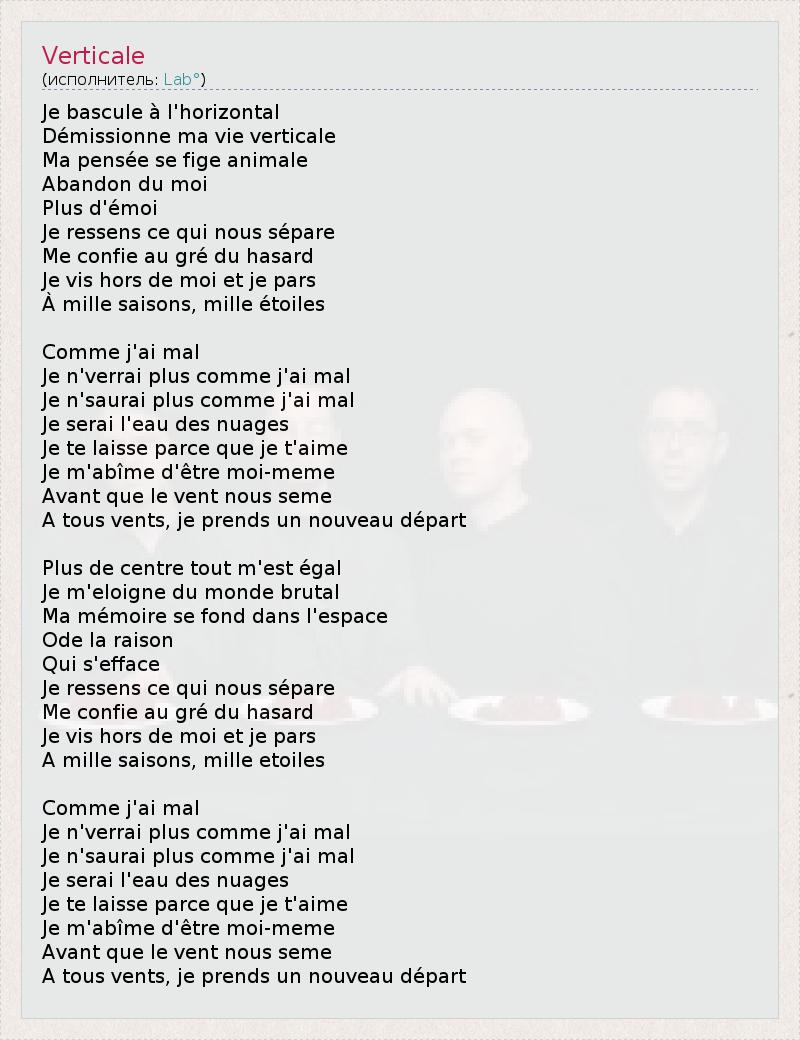 Je bascule à l'horizontal Démissionne ma vie verticale Ma pensée se fige animale Abandon du moi Plus d'émoi Je ressens ce qui nous sépare Me confie au gré du hasard Je vis hors de moi et je pars À mille saisons, mille étoiles Comme j'ai mal Je n'verrai plus comme j'ai mal Je n'saurai plus comme j'ai mal Je serai l'eau des nuages Je te laisse parce que je t'aime Je m'abîme d'être moi-meme Avant que le vent nous seme A tous vents, je prends un nouveau départ Plus de centre tout m'est égal Je m'eloigne du monde brutal Ma mémoire se fond dans l'espace Ode la raison Qui s'efface Je ressens ce qui nous sépare Me confie au gré du hasard Je vis hors de moi et je pars A mille saisons, mille etoiles Comme j'ai mal Je n'verrai plus comme j'ai mal Je n'saurai plus comme j'ai mal Je serai l'eau des nuages Je te laisse parce que je t'aime Je m'abîme d'être moi-meme Avant que le vent nous seme A tous vents, je prends un nouveau départ