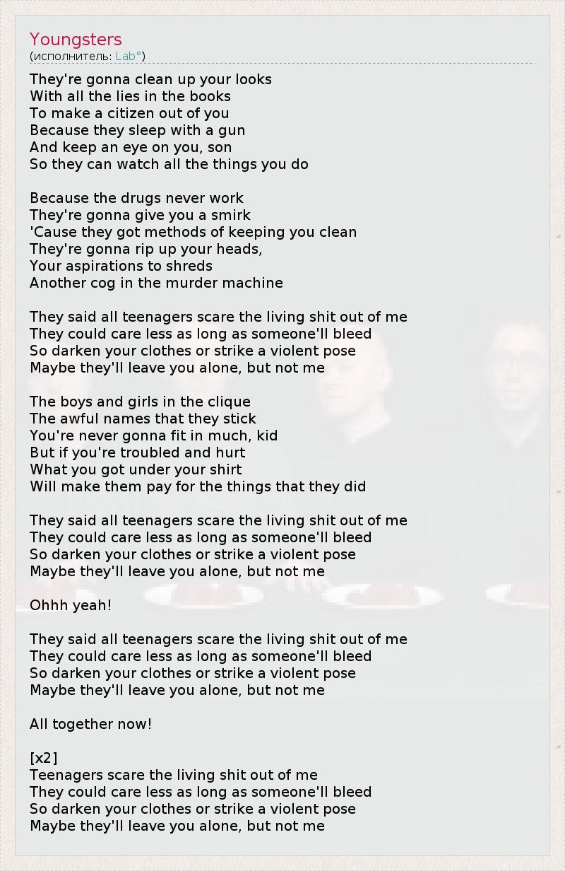 They're gonna clean up your looks With all the lies in the books To make a citizen out of you Because they sleep with a gun And keep an eye on you, son So they can watch all the things you do Because the drugs never work They're gonna give you a smirk 'Cause they got methods of keeping you clean They're gonna rip up your heads, Your aspirations to shreds Another cog in the murder machine They said all teenagers scare the living shit out of me They could care less as long as someone'll bleed So darken your clothes or strike a violent pose Maybe they'll leave you alone, but not me The boys and girls in the clique The awful names that they stick You're never gonna fit in much, kid But if you're troubled and hurt What you got under your shirt Will make them pay for the things that they did They said all teenagers scare the living shit out of me They could care less as long as someone'll bleed So darken your clothes or strike a violent pose Maybe they'll leave you alone, but not me Ohhh yeah! They said all teenagers scare the living shit out of me They could care less as long as someone'll bleed So darken your clothes or strike a violent pose Maybe they'll leave you alone, but not me All together now! [x2] Teenagers scare the living shit out of me They could care less as long as someone'll bleed So darken your clothes or strike a violent pose Maybe they'll leave you alone, but not me