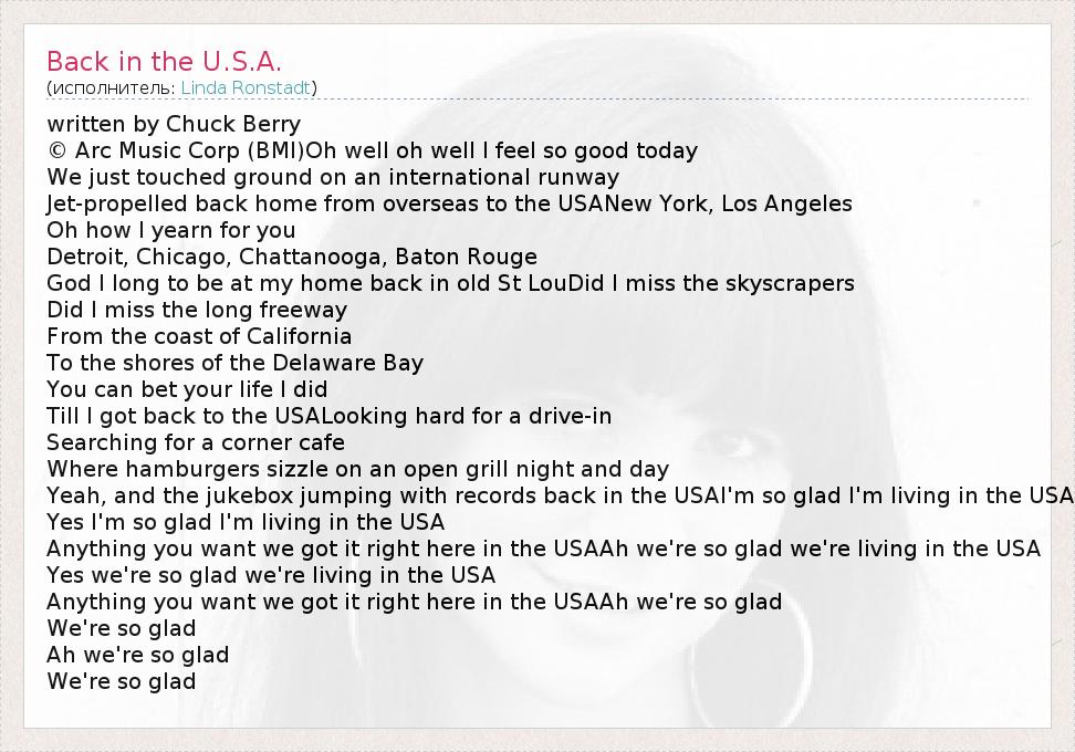 written by Chuck Berry © Arc Music Corp (BMI)Oh well oh well I feel so good today We just touched ground on an international runway Jet-propelled back home from overseas to the USANew York, Los Angeles Oh how I yearn for you Detroit, Chicago, Chattanooga, Baton Rouge God I long to be at my home back in old St LouDid I miss the skyscrapers Did I miss the long freeway From the coast of California To the shores of the Delaware Bay You can bet your life I did Till I got back to the USALooking hard for a drive-in Searching for a corner cafe Where hamburgers sizzle on an open grill night and day Yeah, and the jukebox jumping with records back in the USAI'm so glad I'm living in the USA Yes I'm so glad I'm living in the USA Anything you want we got it right here in the USAAh we're so glad we're living in the USA Yes we're so glad we're living in the USA Anything you want we got it right here in the USAAh we're so glad We're so glad Ah we're so glad We're so glad