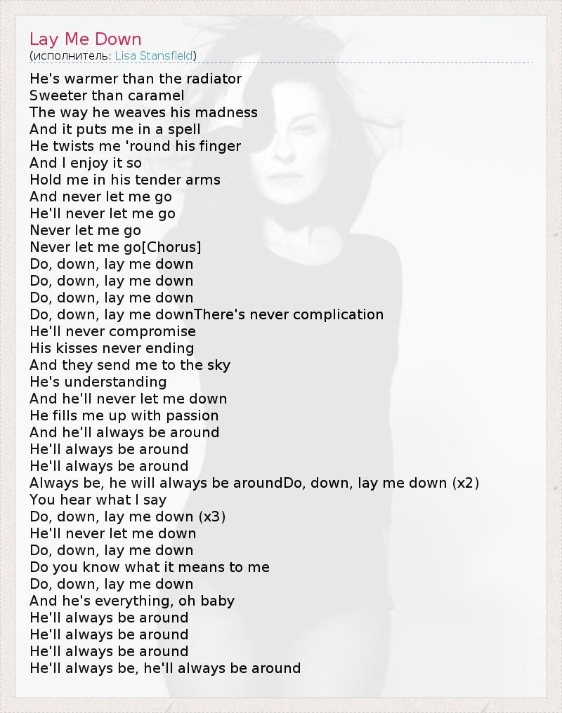 He's warmer than the radiator Sweeter than caramel The way he weaves his madness And it puts me in a spell He twists me 'round his finger And I enjoy it so Hold me in his tender arms And never let me go He'll never let me go Never let me go Never let me go[Chorus] Do, down, lay me down Do, down, lay me down Do, down, lay me down Do, down, lay me downThere's never complication He'll never compromise His kisses never ending And they send me to the sky He's understanding And he'll never let me down He fills me up with passion And he'll always be around He'll always be around He'll always be around Always be, he will always be aroundDo, down, lay me down (x2) You hear what I say Do, down, lay me down (x3) He'll never let me down Do, down, lay me down Do you know what it means to me Do, down, lay me down And he's everything, oh baby He'll always be around He'll always be around He'll always be around He'll always be, he'll always be around