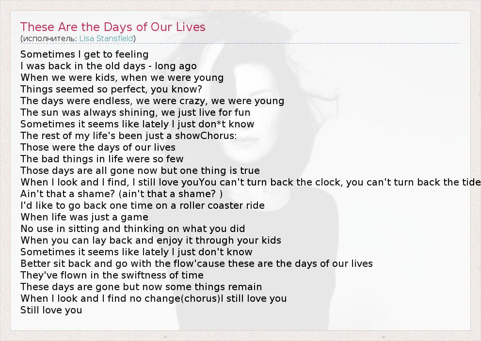 А как ты думаешь, о чем песня "These Are the Days of Our Lives" ?