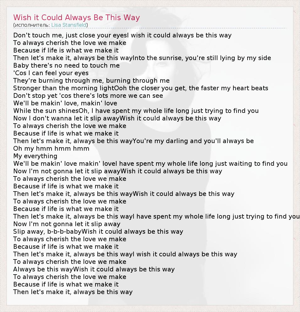 А как ты думаешь, о чем песня "Wish it Could Always Be This Way" ?