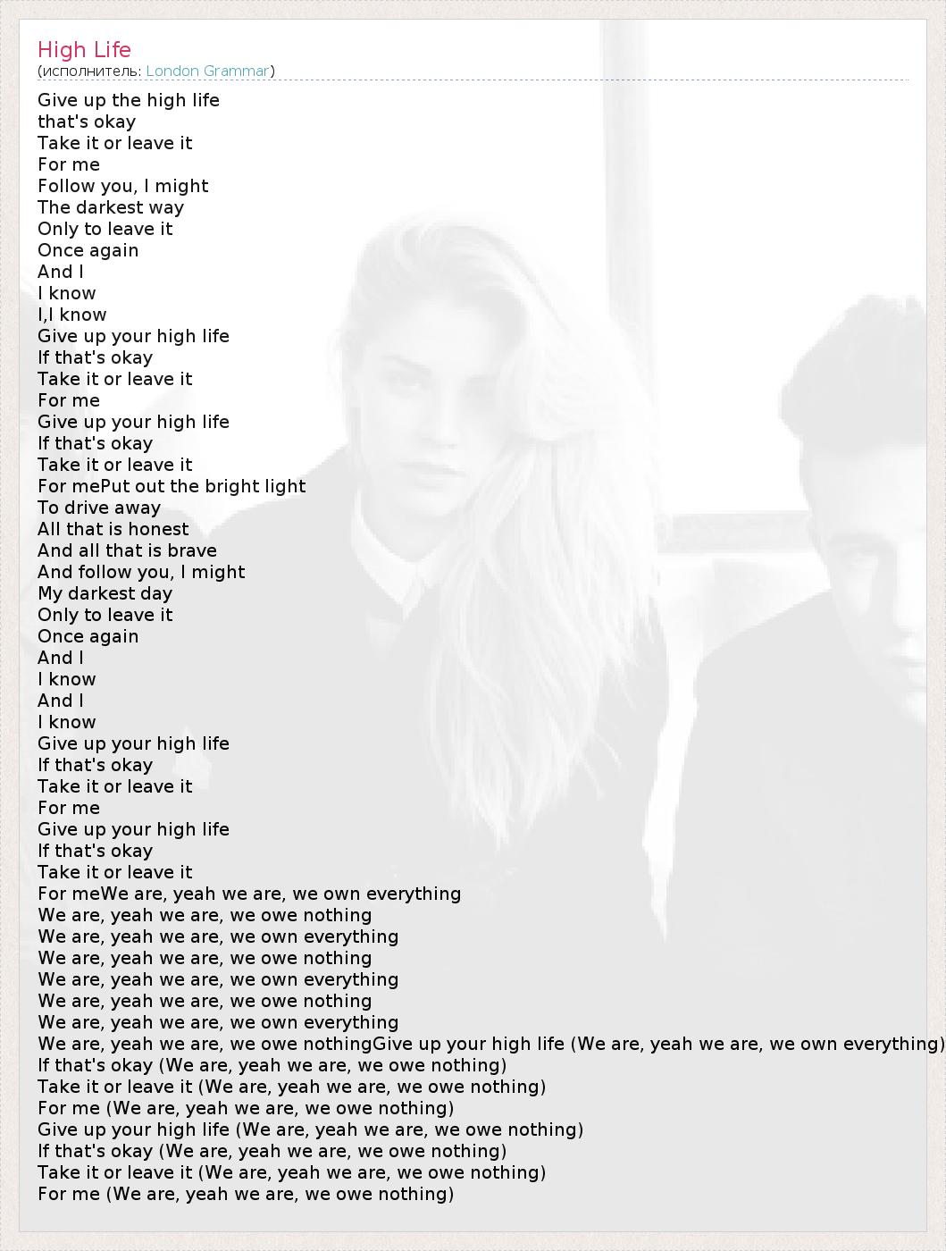 Give up the high life that's okay Take it or leave it For me Follow you, I might The darkest way Only to leave it Once again And I I know I,I know Give up your high life If that's okay Take it or leave it For me Give up your high life If that's okay Take it or leave it For mePut out the bright light To drive away All that is honest And all that is brave And follow you, I might My darkest day Only to leave it Once again And I I know And I I know Give up your high life If that's okay Take it or leave it For me Give up your high life If that's okay Take it or leave it For meWe are, yeah we are, we own everything We are, yeah we are, we owe nothing We are, yeah we are, we own everything We are, yeah we are, we owe nothing We are, yeah we are, we own everything We are, yeah we are, we owe nothing We are, yeah we are, we own everything We are, yeah we are, we owe nothingGive up your high life (We are, yeah we are, we own everything) If that's okay (We are, yeah we are, we owe nothing) Take it or leave it (We are, yeah we are, we owe nothing) For me (We are, yeah we are, we owe nothing) Give up your high life (We are, yeah we are, we owe nothing) If that's okay (We are, yeah we are, we owe nothing) Take it or leave it (We are, yeah we are, we owe nothing) For me (We are, yeah we are, we owe nothing)