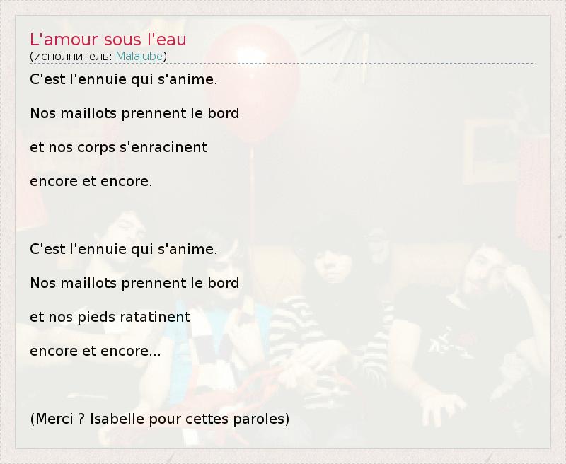 А как ты думаешь, о чем песня "L'amour sous l'eau" ?