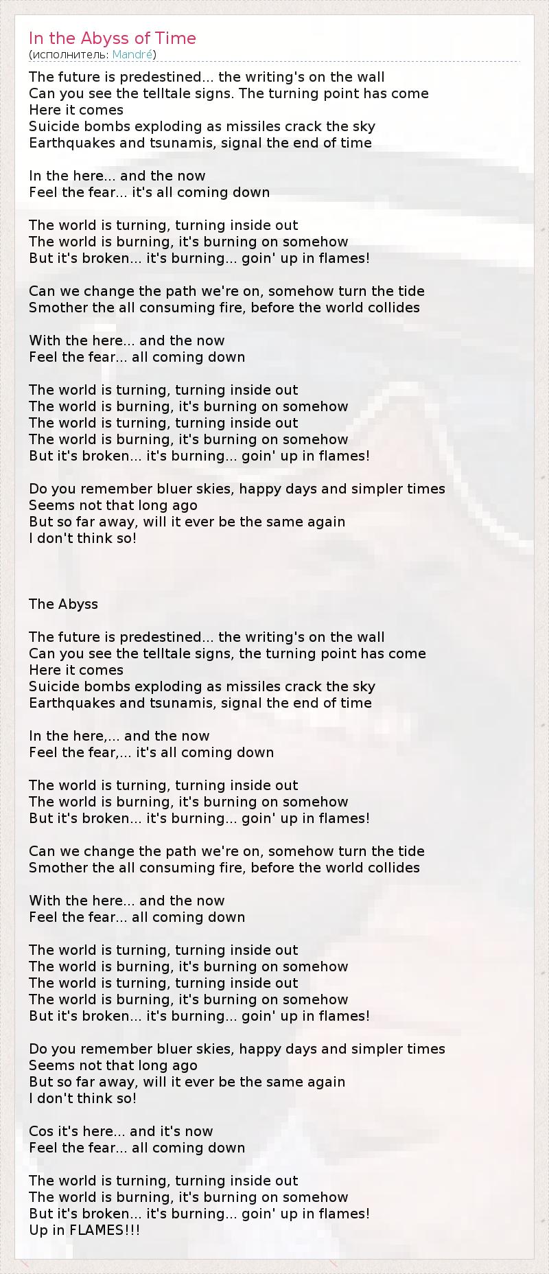 Будущее предопределено... Дурное предзнаменование. Видишь ли ты сигнальные знаки? Настала точка поворота. Вот она! Бомбы-самоубийцы взрываются, когда ракеты прошивают небо. Землетрясения и цунами возвещают конец времен. И здесь... и сейчас... Почувствуй страх... Все рушится. Мир переворачивается... Выворачивается наизнанку. Мир горит... горит, так или иначе. И все разрушено... все горит... исчезает в пламени. Можем ли мы как-то изменить наш путь, как-то развернуть течение? Затушить всепожирающий огонь, прежде чем мир погибнет? И здесь... и сейчас... Почувствуй страх... Все рушится. Мир переворачивается... Выворачивается наизнанку. Мир горит... горит, так или иначе. Мир переворачивается... Выворачивается наизнанку. Мир горит... горит, так или иначе. И все разрушено... все горит... исчезает в пламени. Помнишь ли ты голубые небеса, счастливые дни и простые времена, Кажется, не так давно, Но в то же время так далеко. Будет ли когда-нибудь все снова по-прежнему? Я так не думаю! Бездна* (Сергей Путилин из Липецка) Будущее предрешено – смотрите на стены: Явились знаки ключевого мгновенья, Вы о многом прочтёте – О, суицид! От бомб и ракет в трещинах небо, Катаклизмы, цунами – настало время! Теперь, в этот час, Ощутите страх – всё это пало на нас! Огненный ветер – лишь крики и стон, Повсюду пылает всемирный пожар... Всё зря, не потушишь - лютует огонь. Так можно сломать обстоятельства, изменить путь И пожирающее весь мир пламя задуть? Теперь, в этот час, Ощутите страх – всё это пало на нас! Огненный ветер – лишь крики и стон, Повсюду пылает всемирный пожар... Огненный ветер – лишь крики и стон, Повсюду пылает всемирный пожар... Всё зря, не потушишь - лютует огонь. Вспомни прошлое – ясное небо, счастливые дни. Не так и давно это было, как кажется – Но всё так далеко, что вновь вряд ли наступят они... Я так не думаю! Теперь, в этот час, Ощутите страх – всё это пало на нас! Огненный ветер – лишь крики и стон, Повсюду пылает всемирный пожар... Всё зря, не потушишь - лютует огонь. Всё в огне!!! * поэтический перевод с элементами творческой интерпретации
