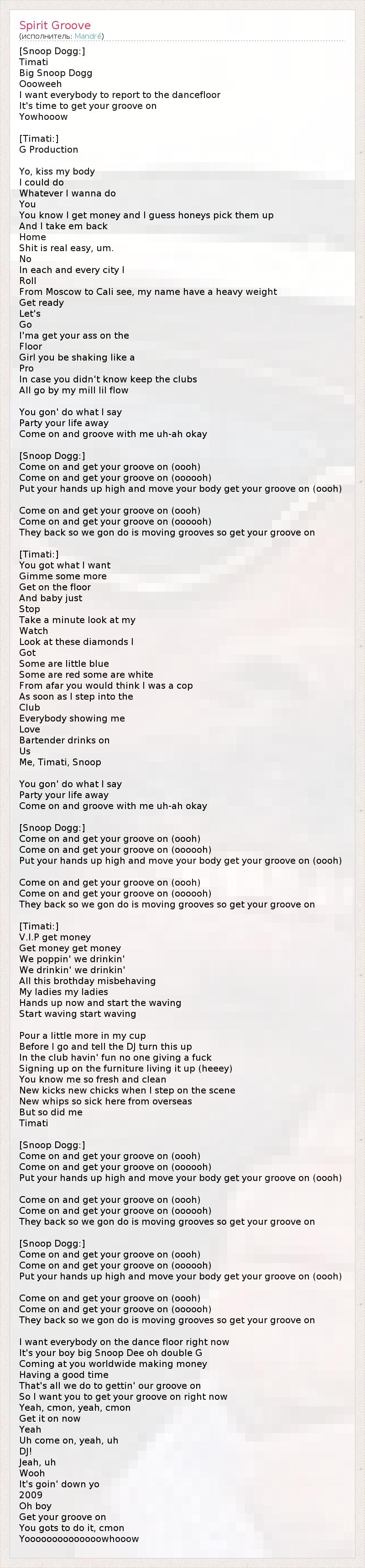 [Snoop Dogg:] Timati Big Snoop Dogg Oooweeh I want everybody to report to the dancefloor It's time to get your groove on Yowhooow [Timati:] G Production Yo, kiss my body I could do Whatever I wanna do You You know I get money and I guess honeys pick them up And I take em back Home Shit is real easy, um. No In each and every city I Roll From Moscow to Cali see, my name have a heavy weight Get ready Let's Go I'ma get your ass on the Floor Girl you be shaking like a Pro In case you didn't know keep the clubs All go by my mill lil flow You gon' do what I say Party your life away Come on and groove with me uh-ah okay [Snoop Dogg:] Come on and get your groove on (oooh) Come on and get your groove on (oooooh) Put your hands up high and move your body get your groove on (oooh) Come on and get your groove on (oooh) Come on and get your groove on (oooooh) They back so we gon do is moving grooves so get your groove on [Timati:] You got what I want Gimme some more Get on the floor And baby just Stop Take a minute look at my Watch Look at these diamonds I Got Some are little blue Some are red some are white From afar you would think I was a cop As soon as I step into the Club Everybody showing me Love Bartender drinks on Us Me, Timati, Snoop You gon' do what I say Party your life away Come on and groove with me uh-ah okay [Snoop Dogg:] Come on and get your groove on (oooh) Come on and get your groove on (oooooh) Put your hands up high and move your body get your groove on (oooh) Come on and get your groove on (oooh) Come on and get your groove on (oooooh) They back so we gon do is moving grooves so get your groove on [Timati:] V.I.P get money Get money get money We poppin' we drinkin' We drinkin' we drinkin' All this brothday misbehaving My ladies my ladies Hands up now and start the waving Start waving start waving Pour a little more in my cup Before I go and tell the DJ turn this up In the club havin' fun no one giving a fuck Signing up on the furniture living it up (heeey) You know me so fresh and clean New kicks new chicks when I step on the scene New whips so sick here from overseas But so did me Timati [Snoop Dogg:] Come on and get your groove on (oooh) Come on and get your groove on (oooooh) Put your hands up high and move your body get your groove on (oooh) Come on and get your groove on (oooh) Come on and get your groove on (oooooh) They back so we gon do is moving grooves so get your groove on [Snoop Dogg:] Come on and get your groove on (oooh) Come on and get your groove on (oooooh) Put your hands up high and move your body get your groove on (oooh) Come on and get your groove on (oooh) Come on and get your groove on (oooooh) They back so we gon do is moving grooves so get your groove on I want everybody on the dance floor right now It's your boy big Snoop Dee oh double G Coming at you worldwide making money Having a good time That's all we do to gettin' our groove on So I want you to get your groove on right now Yeah, cmon, yeah, cmon Get it on now Yeah Uh come on, yeah, uh DJ! Jeah, uh Wooh It's goin' down yo 2009 Oh boy Get your groove on You gots to do it, cmon Yoooooooooooooowhooow