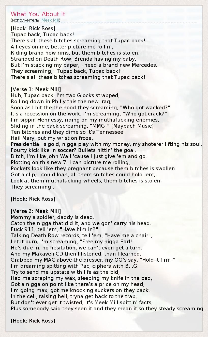[Хук: Rick Ross] Тупак 1 вернулся, Тупак вернулся! Все эти шл*хи орут, что Тупак вернулся! Все взгляды на мне, 2 лучше представьте меня едущим, 3 Еду с новёхонькими дисками, но эти шл*хи украдены. Засели на Death Row, 4 Бренда носит моего ребёнка, 5 Но я коплю деньги, мне нужен новый Mercedes. Они орут: "Тупак вернулся, Тупак вернулся!" Все эти шл*хи орут, что Тупак вернулся! [Куплет 1: Meek Mill] Уф, Тупак вернулся, я хожу с двумя Glock, 6 Остановился в Филадельфии, здесь новый Ирак, Вскоре, как я буду на районе, тут крикнут: "Кого ещё пристрелили?" На работе упадок, я кричу: "У кого есть крэк?" Попиваю Hennessey, побеждаю своих грёб*ных врагов, Сижу на заднем сидении, кричу: "MMG!" 7 (Maybach Music), Десять шлюх и все дешёвки, что ж, это Теннесси. Радуйся Мэри, 8 заморозил запястье, 9 Золотые Presidental, 10 ниггер играл с моими деньгами, мои стрелок поднял его душу. Сорок выстрелов, как в футболе, Пули поражают цель. Шлюха, я, как Джон Уолл, потому что отдаю и убегаю, 11 Строю замыслы в новой семёрке, 12 я могу представить себя за рулём, Карманы, будто беременны, ведь эти шл*хи раздулись. У меня есть обойма, могу поделиться, все эти стукачи получат, Погляди на их греб*ные тачки, эти шлюхи украдены. Они вопят... [Хук: Rick Ross] [Куплет 2: Meek Mill] Мамуля - солдат, папуля мёртв. 13 Поймаем черномазого, который сделал это - принесём его голову. На хер 911, спроси, поступил ли он к ним? Говорил с Death Row Records, велел принести мне стул, 14 Гори оно огнём! Я кричу: "Освободите моего ниг*ера Эрла!" 15 Он, без сомнений, в игре, каждый из нас не может дождаться, чтобы там оказаться. Мой диск Makaveli, 16 тогда я слушал, потом заучил. Схватил свой MAC 17 с комода, старые гангстеры говорят: "Держи крепко!" Я мечтаю пообщаться с Тупаком, сайфер 18 с B.I.G. 19 Отправьте меня на север, чтоб спасти мою жизнь, Вычищаю уши, сплю с кинжалом в кровати, Ниг*ер уже наготове, будто за мою голову объявлена награда, Иду на полную, пинаю этих лохов в спины. Я схвачен, напряжение растёт, пытаюсь вернуться к делам, Но для вас ничего не искажаю, Мик Милл швыряется фактами, К тому же, кто-то сказал, что видел это, и это предсказывали, так что они постоянно вопят... [Хук: Rick Ross] 1 - Тупак Амару Шакур выступавший также под псевдонимами MC New York, 2Pac и Makaveli; при рождении Лесэйн Пэриш Крукс - американский рэпер, киноактер и общественный деятель. 2 - "All Eyez on Me" — двойной альбом Тупака Шакура, был издан 13 февраля 1996 г. Этот альбом очень сильно повлиял на рэп-музыку в целом и определил развитие жанра на годы вперёд. 3 - "Picture Me Rollin'" - песня с альбома "All Eyez on Me". 4 - Американский звукозаписывающий лейбл. Был основан в 1991 году Dr. Dre и Шугом Найтом. В разное время у лейбла был заключён контракт с многими известными рэпперами западного побережья: 2pac, Dr. Dre, Snoop Dogg, Nate Dogg и Tha Dogg Pound. 5 - "Brenda's Got a Baby" — дебютный сингл в карьере Тупака Шакура, записанный к альбому 2Pacalypse Now. 6 - Австрийский пистолет. 7 - Maybach Music Group - звукозаписывающий лейдл, основанный Риком Россом. 8 - "Hail Mary" - третий сингл с альбома "The Don Killuminati: The 7 Day Theory" 9 - "Ice" - "лёд" и "бриллианты". Замороженное запястье - запястье, на котором много бриллиантов. 10 - Марка часов от фирмы Rolex. 11 - Джонатан Хилдред Уолл — американский профессиональный баскетболист, выступающий за команду Национальной баскетбольной ассоциации "Вашингтон Уизардс". Играет на позиции разыгрывающего защитника. Отдавать передачи и отступать - его прямая игровая обязанность. 12 - BMW 7 или седьмая серия BMW - автомобили серии клас