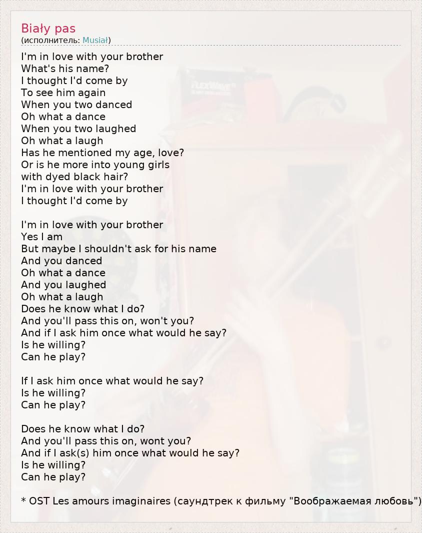 I'm in love with your brother What's his name? I thought I'd come by To see him again When you two danced Oh what a dance When you two laughed Oh what a laugh Has he mentioned my age, love? Or is he more into young girls with dyed black hair? I'm in love with your brother I thought I'd come by I'm in love with your brother Yes I am But maybe I shouldn't ask for his name And you danced Oh what a dance And you laughed Oh what a laugh Does he know what I do? And you'll pass this on, won't you? And if I ask him once what would he say? Is he willing? Can he play? If I ask him once what would he say? Is he willing? Can he play? Does he know what I do? And you'll pass this on, wont you? And if I ask(s) him once what would he say? Is he willing? Can he play? * OST Les amours imaginaires (саундтрек к фильму "Воображаемая любовь")