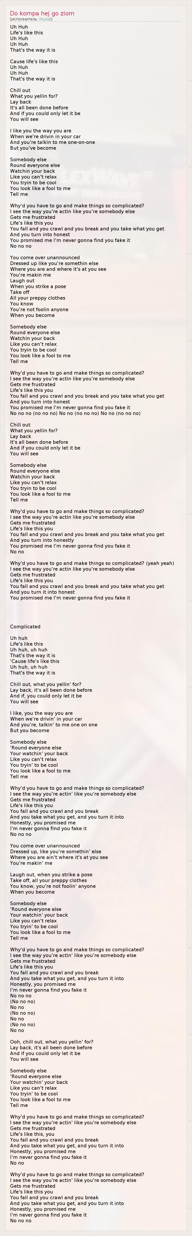 Uh Huh Life's like this Uh Huh Uh Huh That's the way it is Cause life's like this Uh Huh Uh Huh That's the way it is Chill out What you yellin for? Lay back It's all been done before And if you could only let it be You will see I like you the way you are When we're drivin in your car And you're talkin to me one-on-one But you've become Somebody else Round everyone else Watchin your back Like you can't relax You tryin to be cool You look like a fool to me Tell me Why'd you have to go and make things so complicated? I see the way you're actin like you're somebody else Gets me frustrated Life's like this you You fall and you crawl and you break and you take what you get And you turn into honest You promised me I'm never gonna find you fake it No no no You come over unannounced Dressed up like you're somethin else Where you are and where it's at you see You're makin me Laugh out When you strike a pose Take off All your preppy clothes You know You're not foolin anyone When you become Somebody else Round everyone else Watchin your back Like you can't relax You tryin to be cool You look like a fool to me Tell me Why'd you have to go and make things so complicated? I see the way you're actin like you're somebody else Gets me frustrated Life's like this you You fall and you crawl and you break and you take what you get And you turn into honest You promised me I'm never gonna find you fake it No no no (no no no) No no (no no no) No no (no no no) Chill out What you yellin for? Lay back It's all been done before And if you could only let it be You will see Somebody else Round everyone else Watchin your back Like you can't relax You tryin to be cool You look like a fool to me Tell me Why'd you have to go and make things so complicated? I see the way you're actin like you're somebody else Gets me frustrated Life's like this you You fall and you crawl and you break and you take what you get And you turn into honestly You promised me I'm never gonna find you fake it No no Why'd you have to go and make things so complicated? (yeah yeah) I see the way you're actin like you're somebody else Gets me frustrated Life's like this you You fall and you crawl and you break and you take what you get And you turn it into honest You promised me I'm never gonna find you fake it Complicated Uh huh Life's like this Uh huh, uh huh That's the way it is 'Cause life's like this Uh huh, uh huh That's the way it is Chill out, what you yellin' for? Lay back, it's all been done before And if, you could only let it be You will see I like, you the way you are When we're drivin' in your car And you're, talkin' to me one on one But you become Somebody else 'Round everyone else Your watchin' your back Like you can't relax You tryin' to be cool You look like a fool to me Tell me Why'd you have to go and make things so complicated? I see the way you're actin' like you're somebody else Gets me frustrated Life's like this you You fall and you crawl and you break And you take what you get, and you turn it into Honestly, you promised me I'm never gonna find you fake it No no no You come over unannounced Dressed up, like you're somethin' else Where you are ain't where it's at you see You're makin' me Laugh out, when you strike a pose Take off, all your preppy clothes You know, you're not foolin' anyone When you become Somebody else 'Round everyone else Your watchin' your back Like you can't relax You tryin' to be cool You look like a fool to me Tell me Why'd you have to go and make things so complicated? I see the way you're actin' like you're somebody else Gets me frustrated Life's like this you You fall and you crawl and you break And you take what you get, and you turn it into Honestly, you promised me I'm never gonna find you fake it No no no (No no no) No no (No no no) No no (No no no) No no Ooh, chill out, what you yellin' for? Lay back, it's all been done before And if you could only let it be You will see Somebody else 'Round everyone else Your watchin' your back Like you can't relax You tryin' to be cool You look like a fool to me Tell me Why'd you have to go and make things so complicated? I see the way you're actin' like you're somebody else Gets me frustrated Life's like this, you You fall and you crawl and you break And you take what you get, and you turn it into Honestly, you promised me I'm never gonna find you fake it No no Why'd you have to go and make things so complicated? I see the way you're actin' like you're somebody else Gets me frustrated Life's like this you You fall and you crawl and you break And you take what you get, and you turn it into Honestly, you promised me I'm never gonna find you fake it No no no