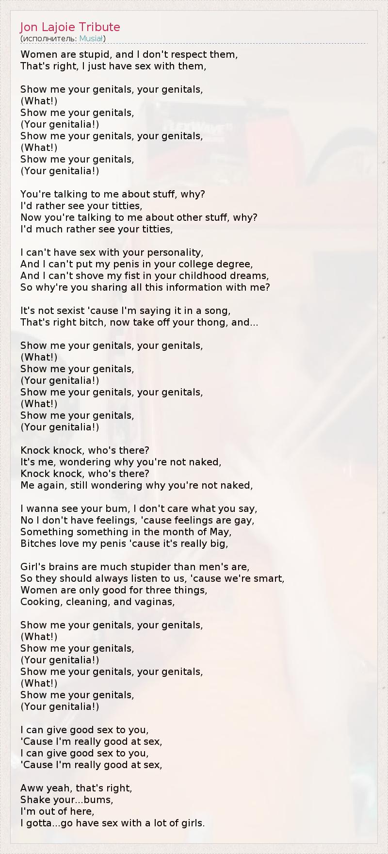 Women are stupid, and I don't respect them, That's right, I just have sex with them, Show me your genitals, your genitals, (What!) Show me your genitals, (Your genitalia!) Show me your genitals, your genitals, (What!) Show me your genitals, (Your genitalia!) You're talking to me about stuff, why? I'd rather see your titties, Now you're talking to me about other stuff, why? I'd much rather see your titties, I can't have sex with your personality, And I can't put my penis in your college degree, And I can't shove my fist in your childhood dreams, So why're you sharing all this information with me? It's not sexist 'cause I'm saying it in a song, That's right bitch, now take off your thong, and... Show me your genitals, your genitals, (What!) Show me your genitals, (Your genitalia!) Show me your genitals, your genitals, (What!) Show me your genitals, (Your genitalia!) Knock knock, who's there? It's me, wondering why you're not naked, Knock knock, who's there? Me again, still wondering why you're not naked, I wanna see your bum, I don't care what you say, No I don't have feelings, 'cause feelings are gay, Something something in the month of May, Bitches love my penis 'cause it's really big, Girl's brains are much stupider than men's are, So they should always listen to us, 'cause we're smart, Women are only good for three things, Cooking, cleaning, and vaginas, Show me your genitals, your genitals, (What!) Show me your genitals, (Your genitalia!) Show me your genitals, your genitals, (What!) Show me your genitals, (Your genitalia!) I can give good sex to you, 'Cause I'm really good at sex, I can give good sex to you, 'Cause I'm really good at sex, Aww yeah, that's right, Shake your...bums, I'm out of here, I gotta...go have sex with a lot of girls.