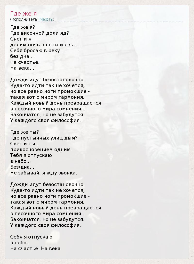 Это интересно:Nефть - это мелодичная музыка, проникновенные тексты и безумная энергетика. Музыка, в которой многие найдут отражение своих чувств и эмоций."Если в мирской жизни идет ежедневная силовая борьба за нефть, то с уверенностью можно заявить, что в музыкальном пространстве отныне есть те, кто способен щедро одаривать своих слушателей нескончаемым потоком «музыкальных баррелей»" (с)... продолжение