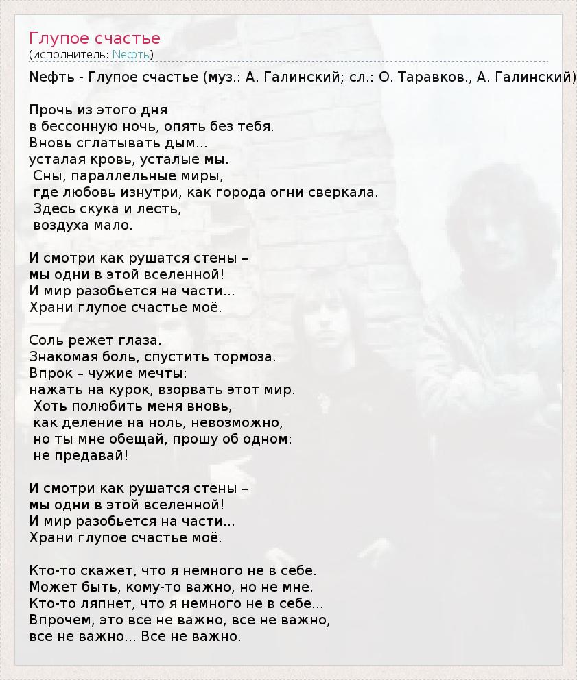 Nефть - Глупое счастье (муз.: А. Галинский; сл.: О. Таравков., А. Галинский) Прочь из этого дня в бессонную ночь, опять без тебя. Вновь сглатывать дым... усталая кровь, усталые мы. Сны, параллельные миры, где любовь изнутри, как города огни сверкала. Здесь скука и лесть, воздуха мало. И смотри как рушатся стены – мы одни в этой вселенной! И мир разобьется на части... Храни глупое счастье моё. Соль режет глаза. Знакомая боль, спустить тормоза. Впрок – чужие мечты: нажать на курок, взорвать этот мир. Хоть полюбить меня вновь, как деление на ноль, невозможно, но ты мне обещай, прошу об одном: не предавай! И смотри как рушатся стены – мы одни в этой вселенной! И мир разобьется на части... Храни глупое счастье моё. Кто-то скажет, что я немного не в себе. Может быть, кому-то важно, но не мне. Кто-то ляпнет, что я немного не в себе... Впрочем, это все не важно, все не важно, все не важно... Все не важно.
