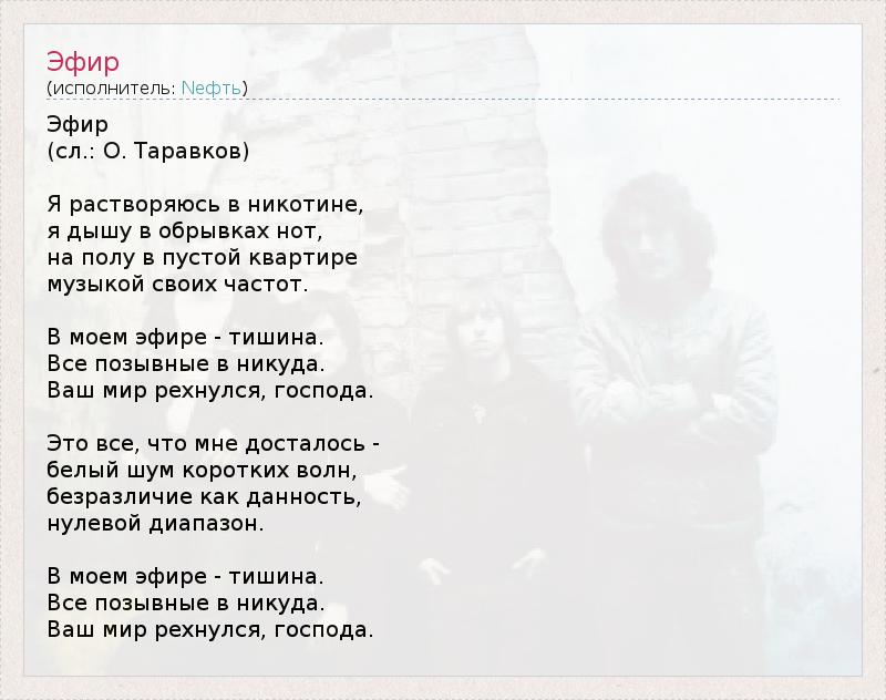 Эфир (сл.: О. Таравков) Я растворяюсь в никотине, я дышу в обрывках нот, на полу в пустой квартире музыкой своих частот. В моем эфире - тишина. Все позывные в никуда. Ваш мир рехнулся, господа. Это все, что мне досталось - белый шум коротких волн, безразличие как данность, нулевой диапазон. В моем эфире - тишина. Все позывные в никуда. Ваш мир рехнулся, господа.