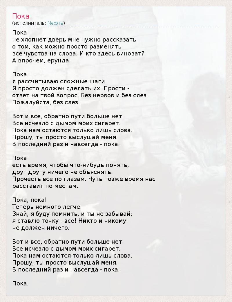 Пока не хлопнет дверь мне нужно рассказать о том, как можно просто разменять все чувства на слова. И кто здесь виноват? А впрочем, ерунда. Пока я рассчитываю сложные шаги. Я просто должен сделать их. Прости - ответ на твой вопрос. Без нервов и без слез. Пожалуйста, без слез. Вот и все, обратно пути больше нет. Все исчезло с дымом моих сигарет. Пока нам остаются только лишь слова. Прошу, ты просто выслушай меня. В последний раз и навсегда - пока. Пока есть время, чтобы что-нибудь понять, друг другу ничего не объяснять. Прочесть все по глазам. Чуть позже время нас расставит по местам. Пока, пока! Теперь немного легче. Знай, я буду помнить, и ты не забывай; я ставлю точку - все! Никто и никому не должен ничего. Вот и все, обратно пути больше нет. Все исчезло с дымом моих сигарет. Пока нам остаются только лишь слова. Прошу, ты просто выслушай меня. В последний раз и навсегда - пока. Пока.