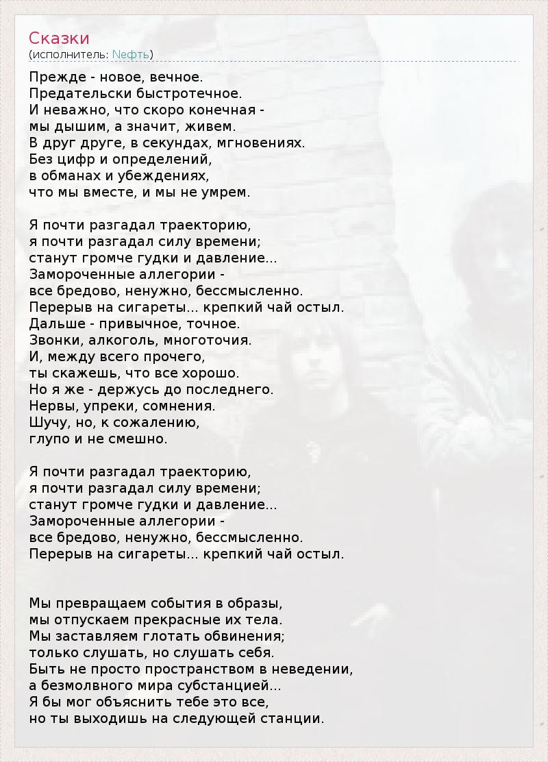 Прежде - новое, вечное. Предательски быстротечное. И неважно, что скоро конечная - мы дышим, а значит, живем. В друг друге, в секундах, мгновениях. Без цифр и определений, в обманах и убеждениях, что мы вместе, и мы не умрем. Я почти разгадал траекторию, я почти разгадал силу времени; станут громче гудки и давление... Замороченные аллегории - все бредово, ненужно, бессмысленно. Перерыв на сигареты... крепкий чай остыл. Дальше - привычное, точное. Звонки, алкоголь, многоточия. И, между всего прочего, ты скажешь, что все хорошо. Но я же - держусь до последнего. Нервы, упреки, сомнения. Шучу, но, к сожалению, глупо и не смешно. Я почти разгадал траекторию, я почти разгадал силу времени; станут громче гудки и давление... Замороченные аллегории - все бредово, ненужно, бессмысленно. Перерыв на сигареты... крепкий чай остыл. Мы превращаем события в образы, мы отпускаем прекрасные их тела. Мы заставляем глотать обвинения; только слушать, но слушать себя. Быть не просто пространством в неведении, а безмолвного мира субстанцией... Я бы мог объяснить тебе это все, но ты выходишь на следующей станции.