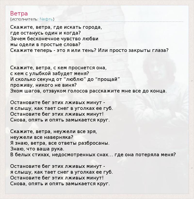 Скажите, ветра, где искать города, где останусь один и когда? Зачем бесконечное чувство любви мы одели в простые слова? Скажите теперь - это я или тень? Или просто закрыты глаза? Скажите, ветра, с кем проснется она, с кем с улыбкой забудет меня? И сколько секунд от “люблю” до “прощай” проживу, никого не виня? Эхом шагов, отзвуком голосов расскажите мне все до конца. Остановите бег этих лживых минут - я слышу, как тает снег в уголках ее губ. Остановите бег этих лживых минут! Снова, опять и опять замыкается круг. Скажите, ветра, неужели все зря, неужели все наверняка? Я знаю, ветра, все ответы разбросаны. Знаю, что ваша рука. В белых стихах, недосмотренных снах… где она потеряла меня? Остановите бег этих лживых минут - я слышу, как тает снег в уголках ее губ. Остановите бег этих лживых минут! Снова, опять и опять замыкается круг.