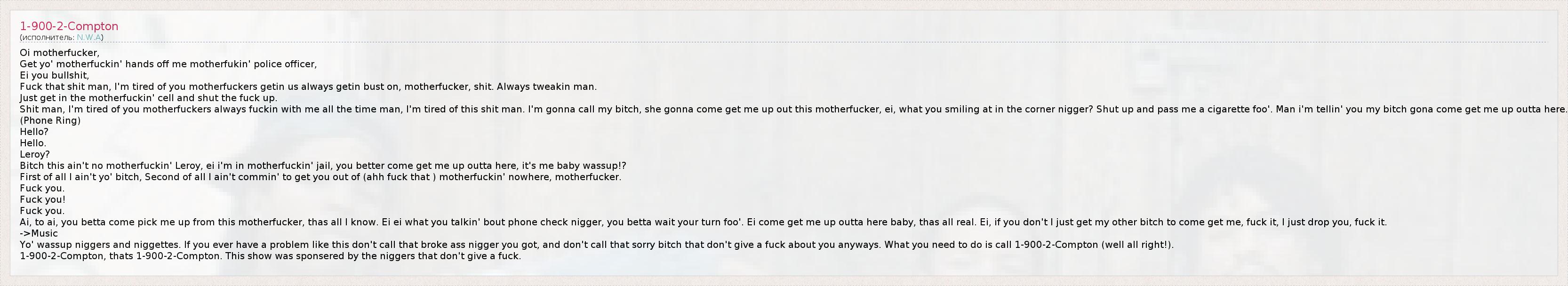 Oi motherfucker, Get yo' motherfuckin' hands off me motherfukin' police officer, Ei you bullshit, Fuck that shit man, I'm tired of you motherfuckers getin us always getin bust on, motherfucker, shit. Always tweakin man. Just get in the motherfuckin' cell and shut the fuck up. Shit man, I'm tired of you motherfuckers always fuckin with me all the time man, I'm tired of this shit man. I'm gonna call my bitch, she gonna come get me up out this motherfucker, ei, what you smiling at in the corner nigger? Shut up and pass me a cigarette foo'. Man i'm tellin' you my bitch gona come get me up outta here. (Phone Ring) Hello? Hello. Leroy? Bitch this ain't no motherfuckin' Leroy, ei i'm in motherfuckin' jail, you better come get me up outta here, it's me baby wassup!? First of all I ain't yo' bitch, Second of all I ain't commin' to get you out of (ahh fuck that ) motherfuckin' nowhere, motherfucker. Fuck you. Fuck you! Fuck you. Ai, to ai, you betta come pick me up from this motherfucker, thas all I know. Ei ei what you talkin' bout phone check nigger, you betta wait your turn foo'. Ei come get me up outta here baby, thas all real. Ei, if you don't I just get my other bitch to come get me, fuck it, I just drop you, fuck it. ->Music Yo' wassup niggers and niggettes. If you ever have a problem like this don't call that broke ass nigger you got, and don't call that sorry bitch that don't give a fuck about you anyways. What you need to do is call 1-900-2-Compton (well all right!). 1-900-2-Compton, thats 1-900-2-Compton. This show was sponsered by the niggers that don't give a fuck.