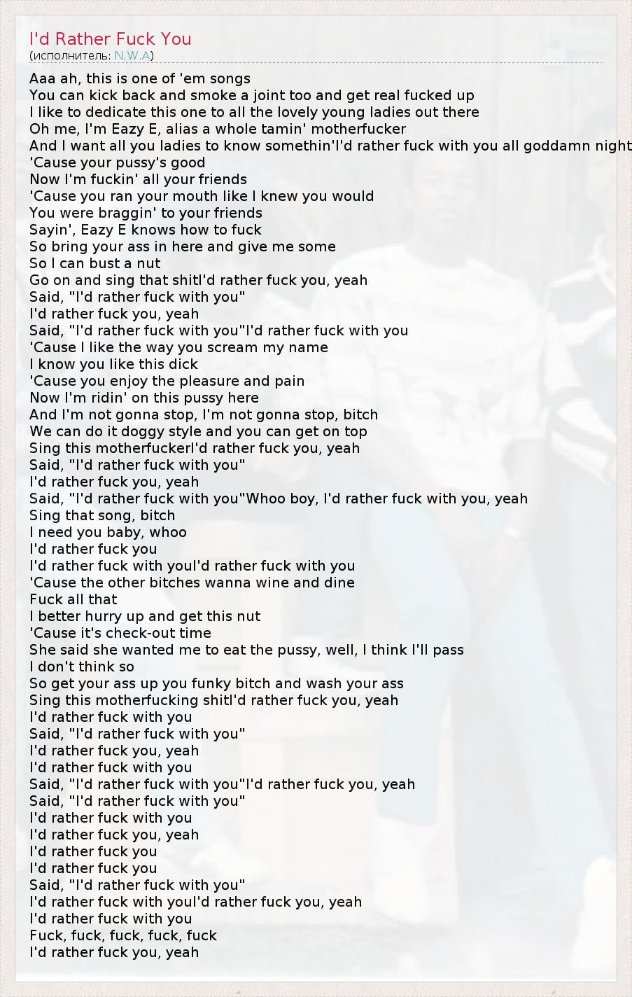 Aaa ah, this is one of 'em songs You can kick back and smoke a joint too and get real fucked up I like to dedicate this one to all the lovely young ladies out there Oh me, I'm Eazy E, alias a whole tamin' motherfucker And I want all you ladies to know somethin'I'd rather fuck with you all goddamn night 'Cause your pussy's good Now I'm fuckin' all your friends 'Cause you ran your mouth like I knew you would You were braggin' to your friends Sayin', Eazy E knows how to fuck So bring your ass in here and give me some So I can bust a nut Go on and sing that shitI'd rather fuck you, yeah Said, "I'd rather fuck with you" I'd rather fuck you, yeah Said, "I'd rather fuck with you"I'd rather fuck with you 'Cause I like the way you scream my name I know you like this dick 'Cause you enjoy the pleasure and pain Now I'm ridin' on this pussy here And I'm not gonna stop, I'm not gonna stop, bitch We can do it doggy style and you can get on top Sing this motherfuckerI'd rather fuck you, yeah Said, "I'd rather fuck with you" I'd rather fuck you, yeah Said, "I'd rather fuck with you"Whoo boy, I'd rather fuck with you, yeah Sing that song, bitch I need you baby, whoo I'd rather fuck you I'd rather fuck with youI'd rather fuck with you 'Cause the other bitches wanna wine and dine Fuck all that I better hurry up and get this nut 'Cause it's check-out time She said she wanted me to eat the pussy, well, I think I'll pass I don't think so So get your ass up you funky bitch and wash your ass Sing this motherfucking shitI'd rather fuck you, yeah I'd rather fuck with you Said, "I'd rather fuck with you" I'd rather fuck you, yeah I'd rather fuck with you Said, "I'd rather fuck with you"I'd rather fuck you, yeah Said, "I'd rather fuck with you" I'd rather fuck with you I'd rather fuck you, yeah I'd rather fuck you I'd rather fuck you Said, "I'd rather fuck with you" I'd rather fuck with youI'd rather fuck you, yeah I'd rather fuck with you Fuck, fuck, fuck, fuck, fuck I'd rather fuck you, yeah