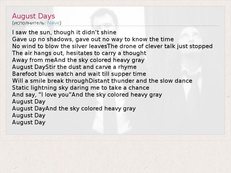 А как ты думаешь, о чем песня "August Days" ?
