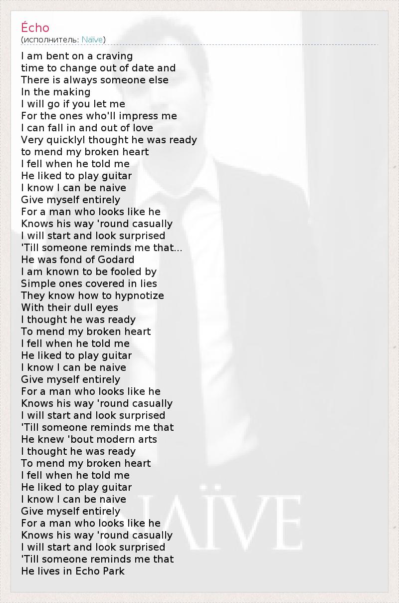 I am bent on a craving time to change out of date and There is always someone else In the making I will go if you let me For the ones who'll impress me I can fall in and out of love Very quicklyI thought he was ready to mend my broken heart I fell when he told me He liked to play guitar I know I can be naive Give myself entirely For a man who looks like he Knows his way 'round casually I will start and look surprised 'Till someone reminds me that... He was fond of Godard I am known to be fooled by Simple ones covered in lies They know how to hypnotize With their dull eyes I thought he was ready To mend my broken heart I fell when he told me He liked to play guitar I know I can be naive Give myself entirely For a man who looks like he Knows his way 'round casually I will start and look surprised 'Till someone reminds me that He knew 'bout modern arts I thought he was ready To mend my broken heart I fell when he told me He liked to play guitar I know I can be naive Give myself entirely For a man who looks like he Knows his way 'round casually I will start and look surprised 'Till someone reminds me that He lives in Echo Park