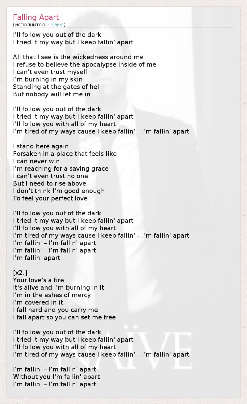 I'll follow you out of the dark I tried it my way but I keep fallin' apart All that I see is the wickedness around me I refuse to believe the apocalypse inside of me I can't even trust myself I'm burning in my skin Standing at the gates of hell But nobody will let me in I'll follow you out of the dark I tried it my way but I keep fallin' apart I'll follow you with all of my heart I'm tired of my ways cause I keep fallin' – I'm fallin' apart I stand here again Forsaken in a place that feels like I can never win I'm reaching for a saving grace I can't even trust no one But I need to rise above I don't think I'm good enough To feel your perfect love I'll follow you out of the dark I tried it my way but I keep fallin' apart I'll follow you with all of my heart I'm tired of my ways cause I keep fallin' – I'm fallin' apart I'm fallin' – I'm fallin' apart I'm fallin' – I'm fallin' apart I'm fallin' apart [x2:] Your love's a fire It's alive and I'm burning in it I'm in the ashes of mercy I'm covered in it I fall hard and you carry me I fall apart so you can set me free I'll follow you out of the dark I tried it my way but I keep fallin' apart I'll follow you with all of my heart I'm tired of my ways cause I keep fallin' – I'm fallin' apart I'm fallin' – I'm fallin' apart Without you I'm fallin' apart I'm fallin' – I'm fallin' apart