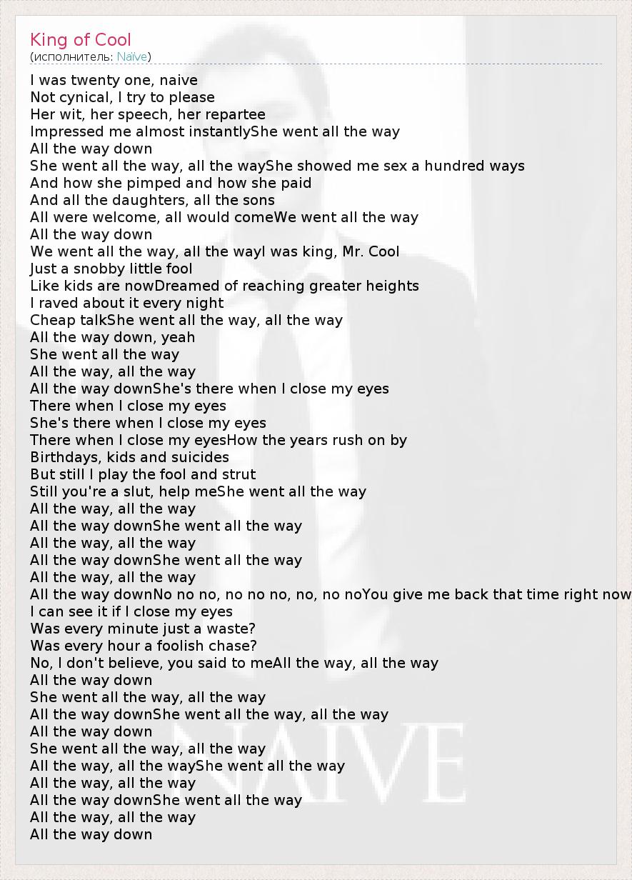 I was twenty one, naive Not cynical, I try to please Her wit, her speech, her repartee Impressed me almost instantlyShe went all the way All the way down She went all the way, all the wayShe showed me sex a hundred ways And how she pimped and how she paid And all the daughters, all the sons All were welcome, all would comeWe went all the way All the way down We went all the way, all the wayI was king, Mr. Cool Just a snobby little fool Like kids are nowDreamed of reaching greater heights I raved about it every night Cheap talkShe went all the way, all the way All the way down, yeah She went all the way All the way, all the way All the way downShe's there when I close my eyes There when I close my eyes She's there when I close my eyes There when I close my eyesHow the years rush on by Birthdays, kids and suicides But still I play the fool and strut Still you're a slut, help meShe went all the way All the way, all the way All the way downShe went all the way All the way, all the way All the way downShe went all the way All the way, all the way All the way downNo no no, no no no, no, no noYou give me back that time right now I can see it if I close my eyes Was every minute just a waste? Was every hour a foolish chase? No, I don't believe, you said to meAll the way, all the way All the way down She went all the way, all the way All the way downShe went all the way, all the way All the way down She went all the way, all the way All the way, all the wayShe went all the way All the way, all the way All the way downShe went all the way All the way, all the way All the way down