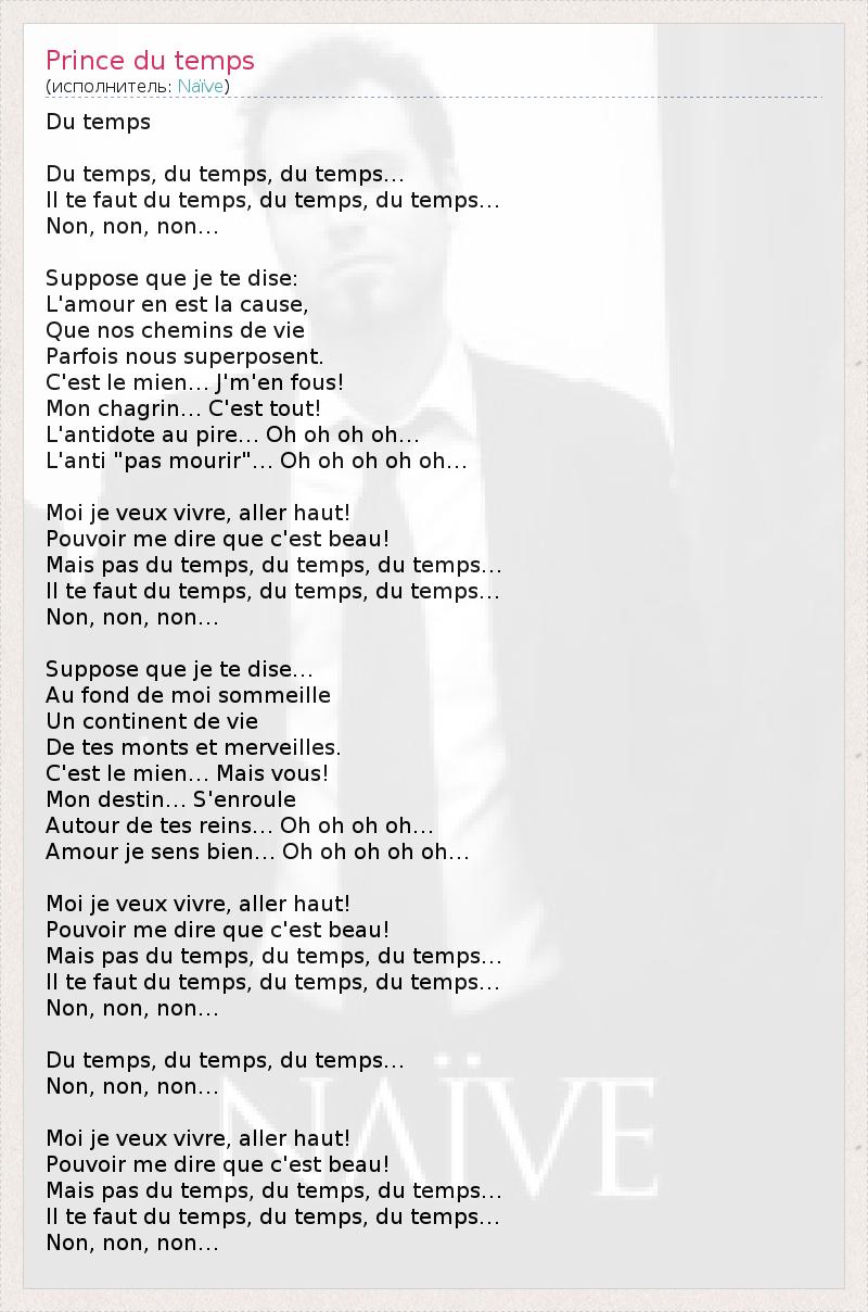 Время (автор перевода Deces) Время, время, время… Тебе нужно время, время, время… Нет, нет, нет… Предположи, что я говорю тебе: Любовь – это причина того, Что наши жизненные пути Иногда пересекают нас 1. Это моё… Мне плевать! Моя печаль… Это – всё! Противоядие худшему… Анти–«не умирать»… А я хочу жить, идти ввысь! Мочь сказать себе, что это прекрасно! Но нет времени, времени, времени… Тебе нужно время, время, время… Нет, нет, нет… Предположи, что я говорю тебе: В глубине моей души дремлет Материк жизни Из твоих гор и чудес. Это моё… Но вы! Моя судьба… Обвивается Вокруг твоей талии… Любовь, я её хорошо знаю… А я хочу жить, идти ввысь! Мочь сказать себе, что это прекрасно! Но нет времени, времени, времени… Тебе нужно время, время, время… Нет, нет, нет… Время, время, время… Нет, нет, нет… А я хочу жить, идти ввысь! Мочь сказать себе, что это прекрасно! Но нет времени, времени, времени… Тебе нужно время, время, время… Нет, нет, нет…
