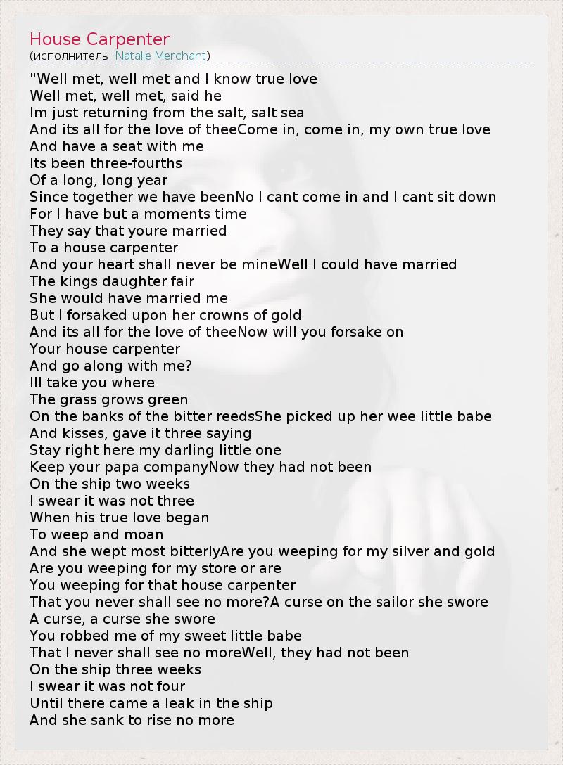 "Well met, well met and I know true love Well met, well met, said he Im just returning from the salt, salt sea And its all for the love of theeCome in, come in, my own true love And have a seat with me Its been three-fourths Of a long, long year Since together we have beenNo I cant come in and I cant sit down For I have but a moments time They say that youre married To a house carpenter And your heart shall never be mineWell I could have married The kings daughter fair She would have married me But I forsaked upon her crowns of gold And its all for the love of theeNow will you forsake on Your house carpenter And go along with me? Ill take you where The grass grows green On the banks of the bitter reedsShe picked up her wee little babe And kisses, gave it three saying Stay right here my darling little one Keep your papa companyNow they had not been On the ship two weeks I swear it was not three When his true love began To weep and moan And she wept most bitterlyAre you weeping for my silver and gold Are you weeping for my store or are You weeping for that house carpenter That you never shall see no more?A curse on the sailor she swore A curse, a curse she swore You robbed me of my sweet little babe That I never shall see no moreWell, they had not been On the ship three weeks I swear it was not four Until there came a leak in the ship And she sank to rise no more