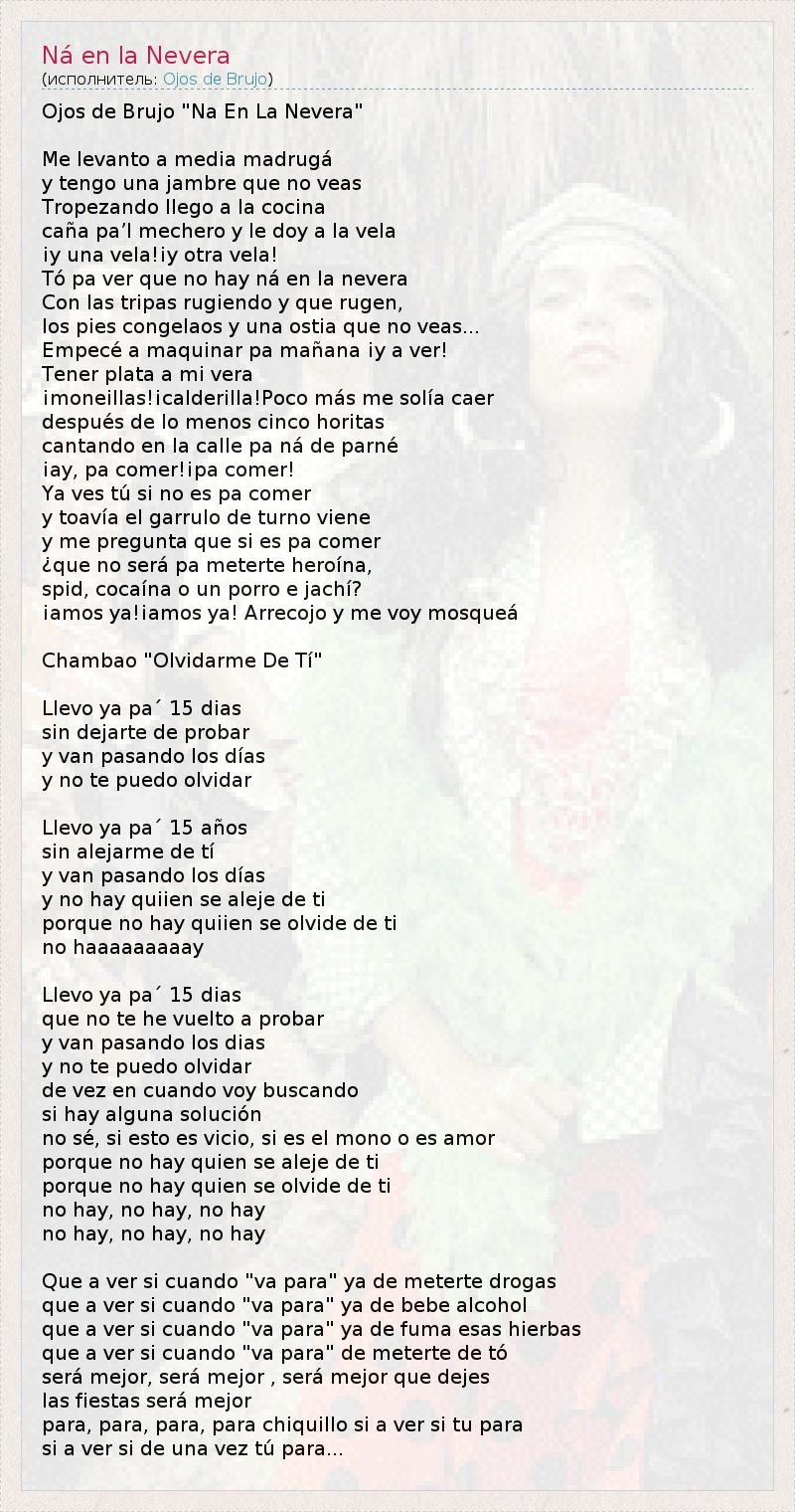 Ojos de Brujo "Na En La Nevera" Me levanto a media madrugá y tengo una jambre que no veas Tropezando llego a la cocina caña pa’l mechero y le doy a la vela ¡y una vela!¡y otra vela! Tó pa ver que no hay ná en la nevera Con las tripas rugiendo y que rugen, los pies congelaos y una ostia que no veas... Empecé a maquinar pa mañana ¡y a ver! Tener plata a mi vera ¡moneillas!¡calderilla!Poco más me solía caer después de lo menos cinco horitas cantando en la calle pa ná de parné ¡ay, pa comer!¡pa comer! Ya ves tú si no es pa comer y toavía el garrulo de turno viene y me pregunta que si es pa comer ¿que no será pa meterte heroína, spid, cocaína o un porro e jachí? ¡amos ya!¡amos ya! Arrecojo y me voy mosqueá Chambao "Olvidarme De Tí" Llevo ya pa´ 15 dias sin dejarte de probar y van pasando los días y no te puedo olvidar Llevo ya pa´ 15 años sin alejarme de tí y van pasando los días y no hay quiien se aleje de ti porque no hay quiien se olvide de ti no haaaaaaaaay Llevo ya pa´ 15 dias que no te he vuelto a probar y van pasando los dias y no te puedo olvidar de vez en cuando voy buscando si hay alguna solución no sé, si esto es vicio, si es el mono o es amor porque no hay quien se aleje de ti porque no hay quien se olvide de ti no hay, no hay, no hay no hay, no hay, no hay Que a ver si cuando "va para" ya de meterte drogas que a ver si cuando "va para" ya de bebe alcohol que a ver si cuando "va para" ya de fuma esas hierbas que a ver si cuando "va para" de meterte de tó será mejor, será mejor , será mejor que dejes las fiestas será mejor para, para, para, para chiquillo si a ver si tu para si a ver si de una vez tú para...