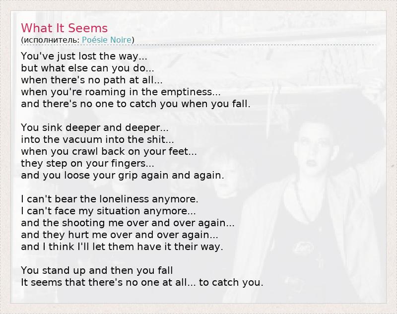 You've just lost the way... but what else can you do... when there's no path at all... when you're roaming in the emptiness... and there's no one to catch you when you fall. You sink deeper and deeper... into the vacuum into the shit... when you crawl back on your feet... they step on your fingers... and you loose your grip again and again. I can't bear the loneliness anymore. I can't face my situation anymore... and the shooting me over and over again... and they hurt me over and over again... and I think I'll let them have it their way. You stand up and then you fall It seems that there's no one at all... to catch you.