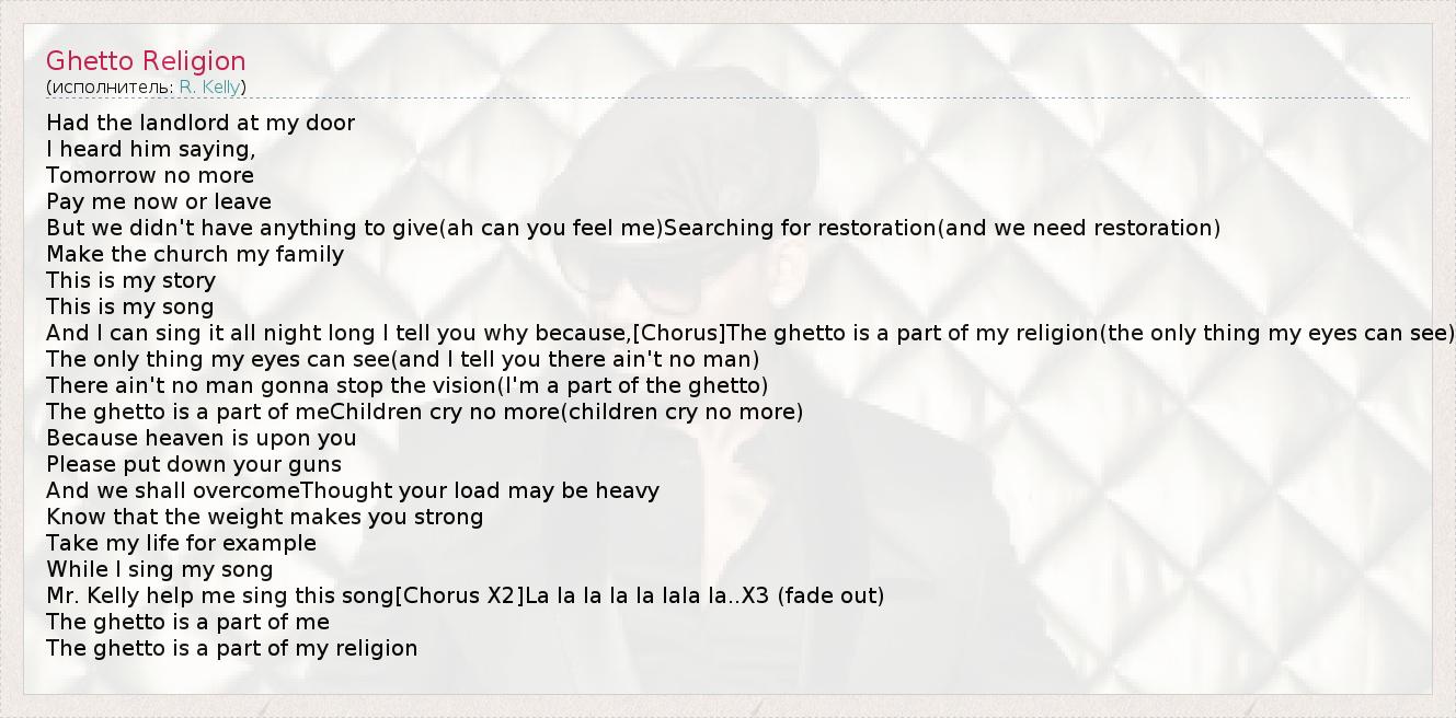 Had the landlord at my door I heard him saying, Tomorrow no more Pay me now or leave But we didn't have anything to give(ah can you feel me)Searching for restoration(and we need restoration) Make the church my family This is my story This is my song And I can sing it all night long I tell you why because,[Chorus]The ghetto is a part of my religion(the only thing my eyes can see) The only thing my eyes can see(and I tell you there ain't no man) There ain't no man gonna stop the vision(I'm a part of the ghetto) The ghetto is a part of meChildren cry no more(children cry no more) Because heaven is upon you Please put down your guns And we shall overcomeThought your load may be heavy Know that the weight makes you strong Take my life for example While I sing my song Mr. Kelly help me sing this song[Chorus X2]La la la la la lala la..X3 (fade out) The ghetto is a part of me The ghetto is a part of my religion