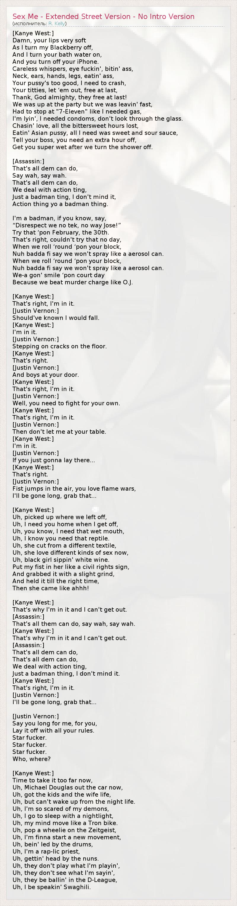 А как ты думаешь, о чем песня "Sex Me - Extended Street Version - No Intro Version" ?