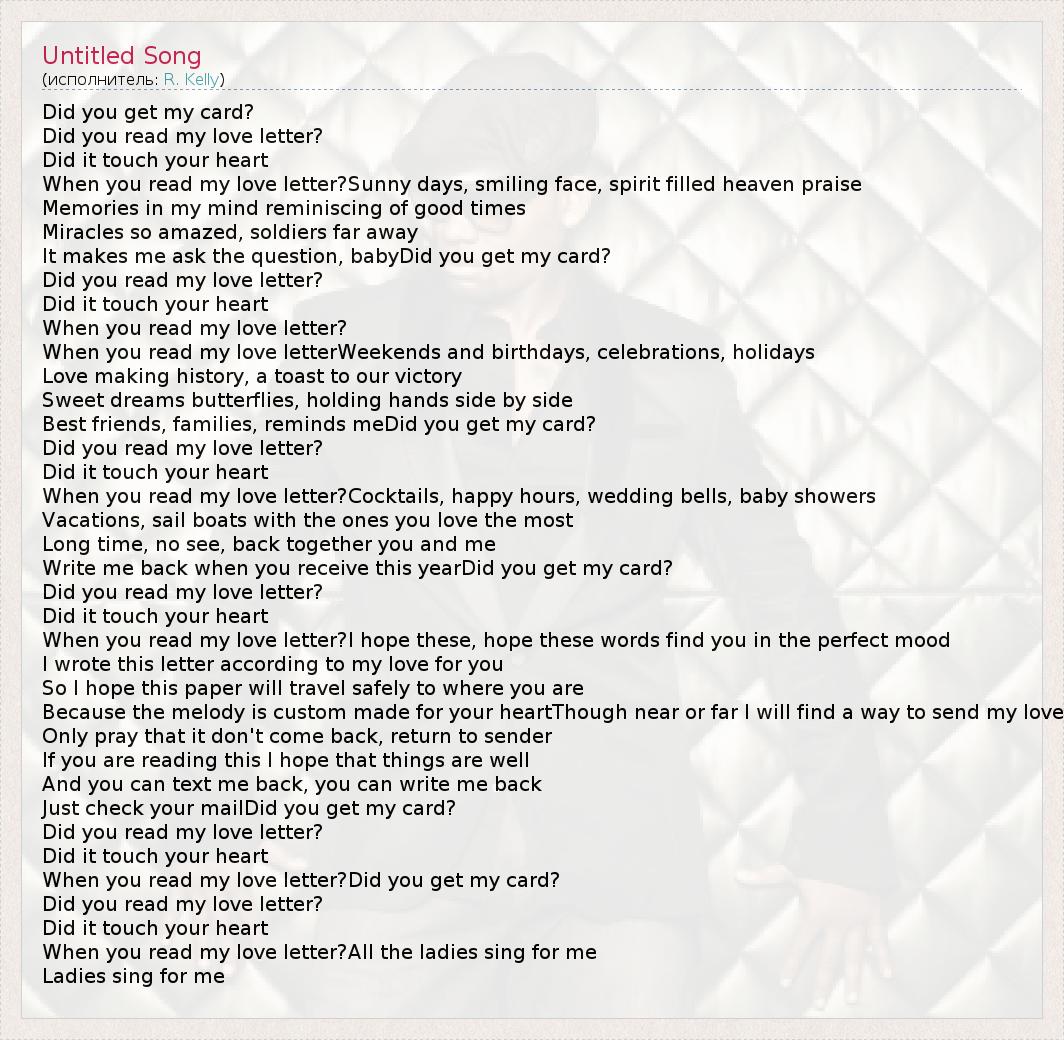 Did you get my card? Did you read my love letter? Did it touch your heart When you read my love letter?Sunny days, smiling face, spirit filled heaven praise Memories in my mind reminiscing of good times Miracles so amazed, soldiers far away It makes me ask the question, babyDid you get my card? Did you read my love letter? Did it touch your heart When you read my love letter? When you read my love letterWeekends and birthdays, celebrations, holidays Love making history, a toast to our victory Sweet dreams butterflies, holding hands side by side Best friends, families, reminds meDid you get my card? Did you read my love letter? Did it touch your heart When you read my love letter?Cocktails, happy hours, wedding bells, baby showers Vacations, sail boats with the ones you love the most Long time, no see, back together you and me Write me back when you receive this yearDid you get my card? Did you read my love letter? Did it touch your heart When you read my love letter?I hope these, hope these words find you in the perfect mood I wrote this letter according to my love for you So I hope this paper will travel safely to where you are Because the melody is custom made for your heartThough near or far I will find a way to send my love Only pray that it don't come back, return to sender If you are reading this I hope that things are well And you can text me back, you can write me back Just check your mailDid you get my card? Did you read my love letter? Did it touch your heart When you read my love letter?Did you get my card? Did you read my love letter? Did it touch your heart When you read my love letter?All the ladies sing for me Ladies sing for me
