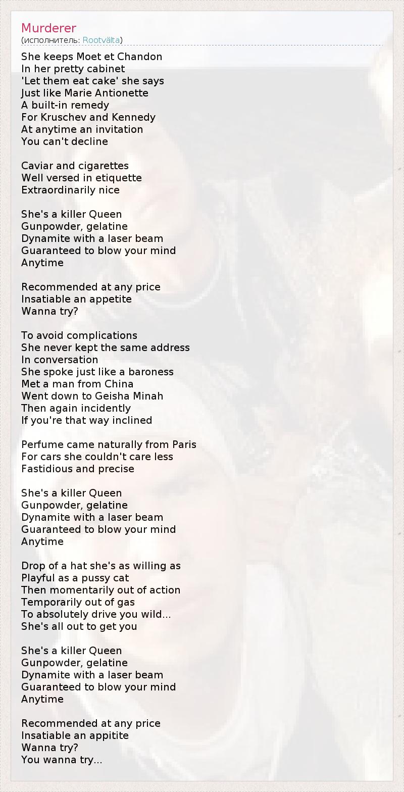 She keeps Moet et Chandon In her pretty cabinet 'Let them eat cake' she says Just like Marie Antionette A built-in remedy For Kruschev and Kennedy At anytime an invitation You can't decline Caviar and cigarettes Well versed in etiquette Extraordinarily nice She's a killer Queen Gunpowder, gelatine Dynamite with a laser beam Guaranteed to blow your mind Anytime Recommended at any price Insatiable an appetite Wanna try? To avoid complications She never kept the same address In conversation She spoke just like a baroness Met a man from China Went down to Geisha Minah Then again incidently If you're that way inclined Perfume came naturally from Paris For cars she couldn't care less Fastidious and precise She's a killer Queen Gunpowder, gelatine Dynamite with a laser beam Guaranteed to blow your mind Anytime Drop of a hat she's as willing as Playful as a pussy cat Then momentarily out of action Temporarily out of gas To absolutely drive you wild... She's all out to get you She's a killer Queen Gunpowder, gelatine Dynamite with a laser beam Guaranteed to blow your mind Anytime Recommended at any price Insatiable an appitite Wanna try? You wanna try...